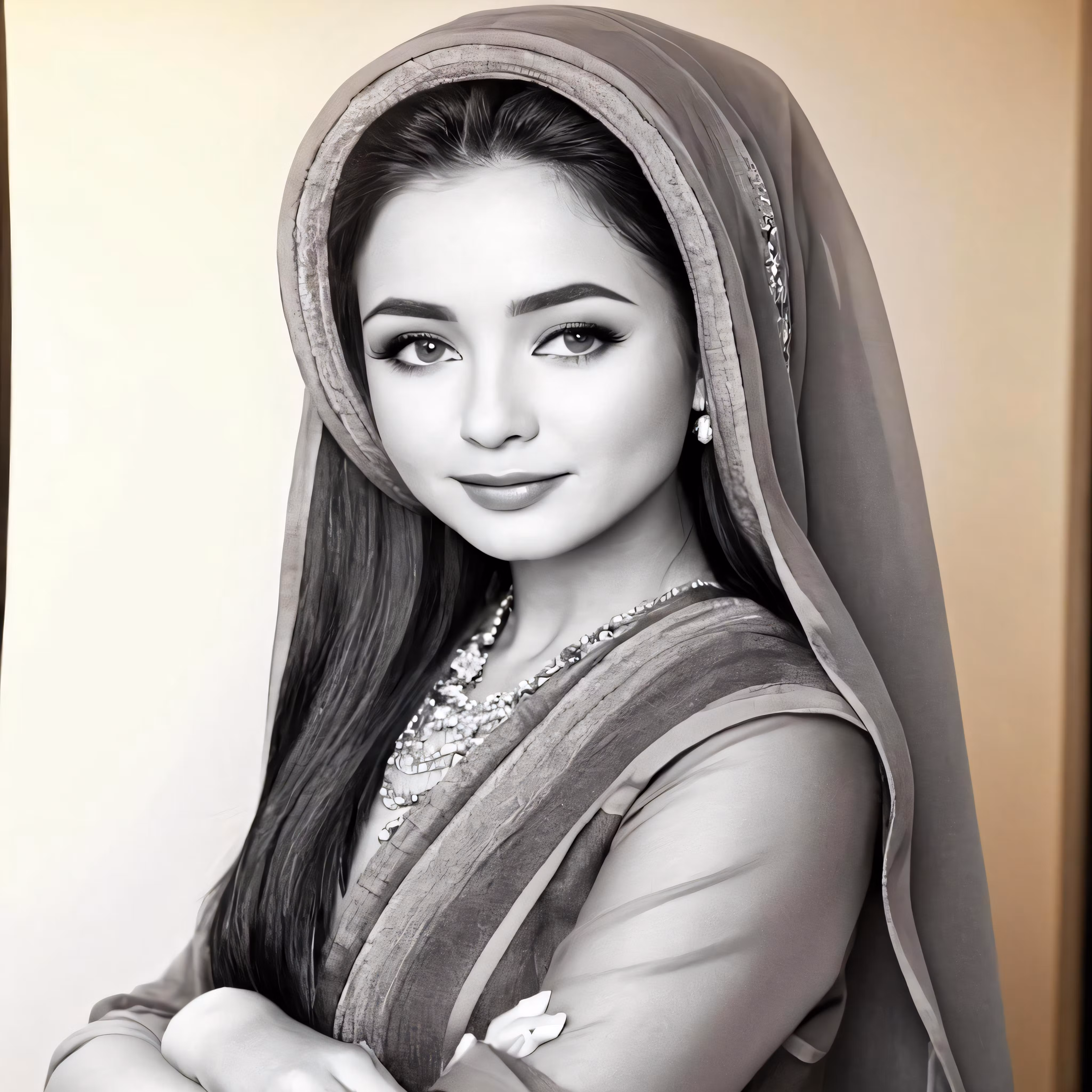 High resolution picture, free to use, black and white photograph of a woman in traditional indian clothing
