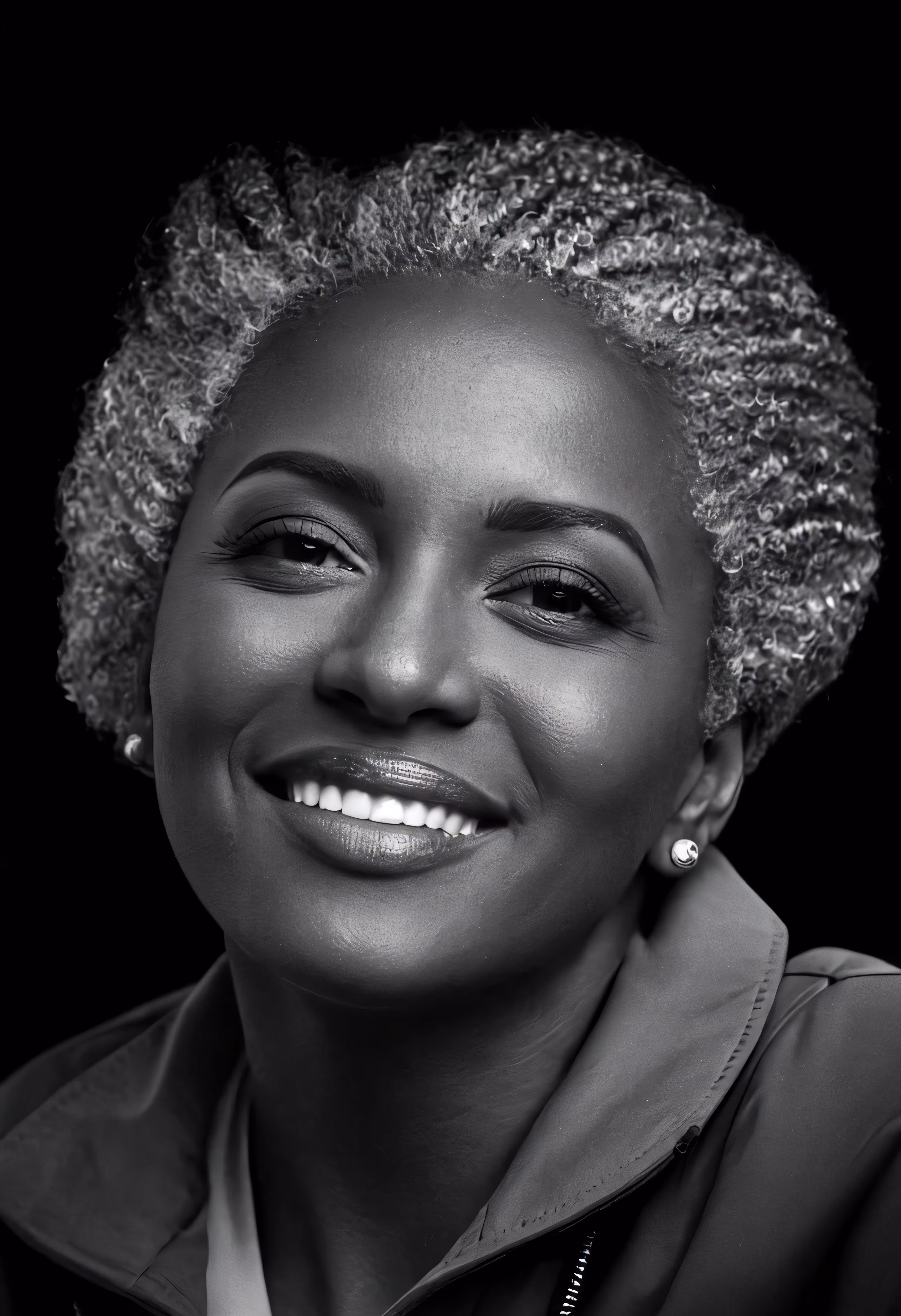 High resolution picture, free to use, black and white portrait of a woman with curly hair smiling