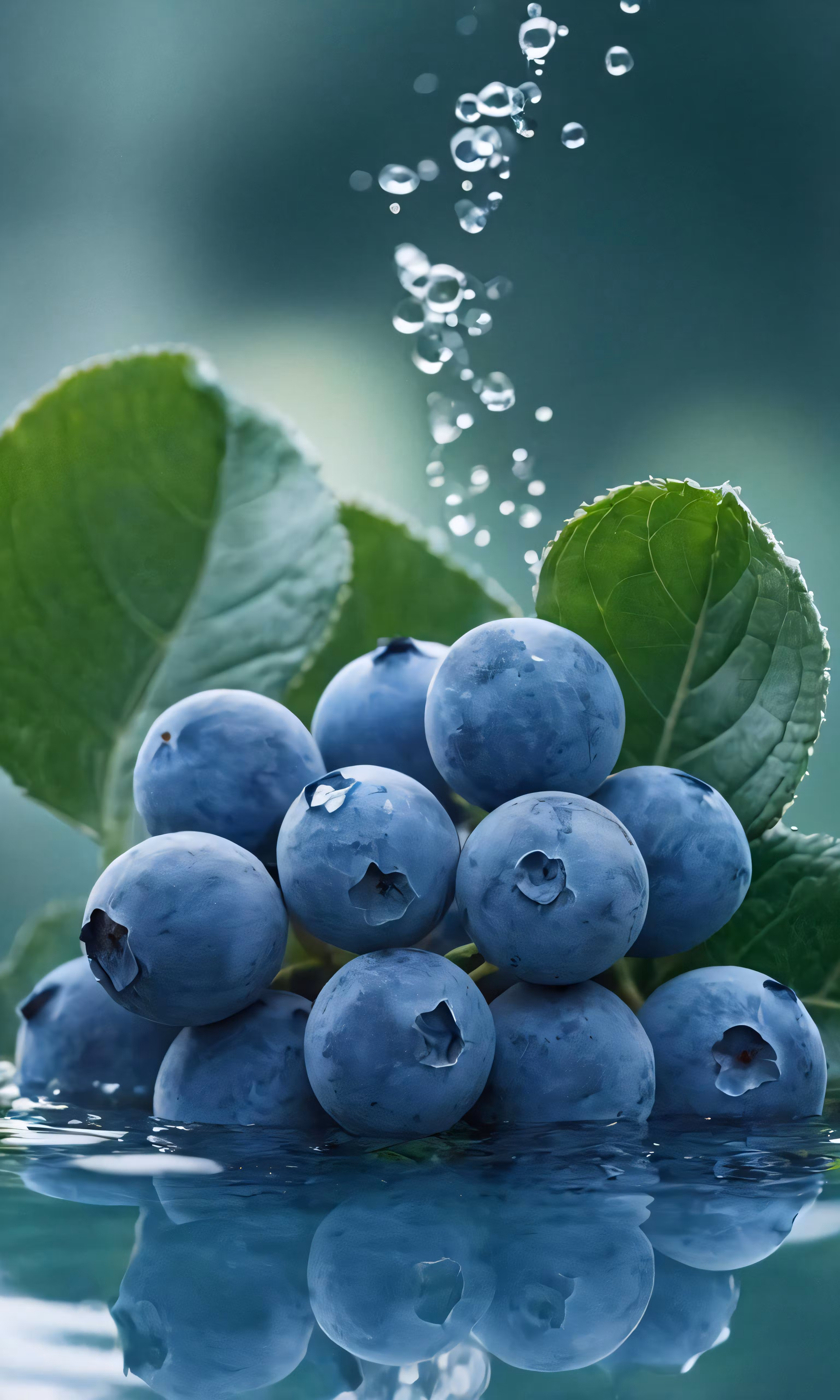 High resolution picture, free to use, blueberries, leaves and water are displayed on a table