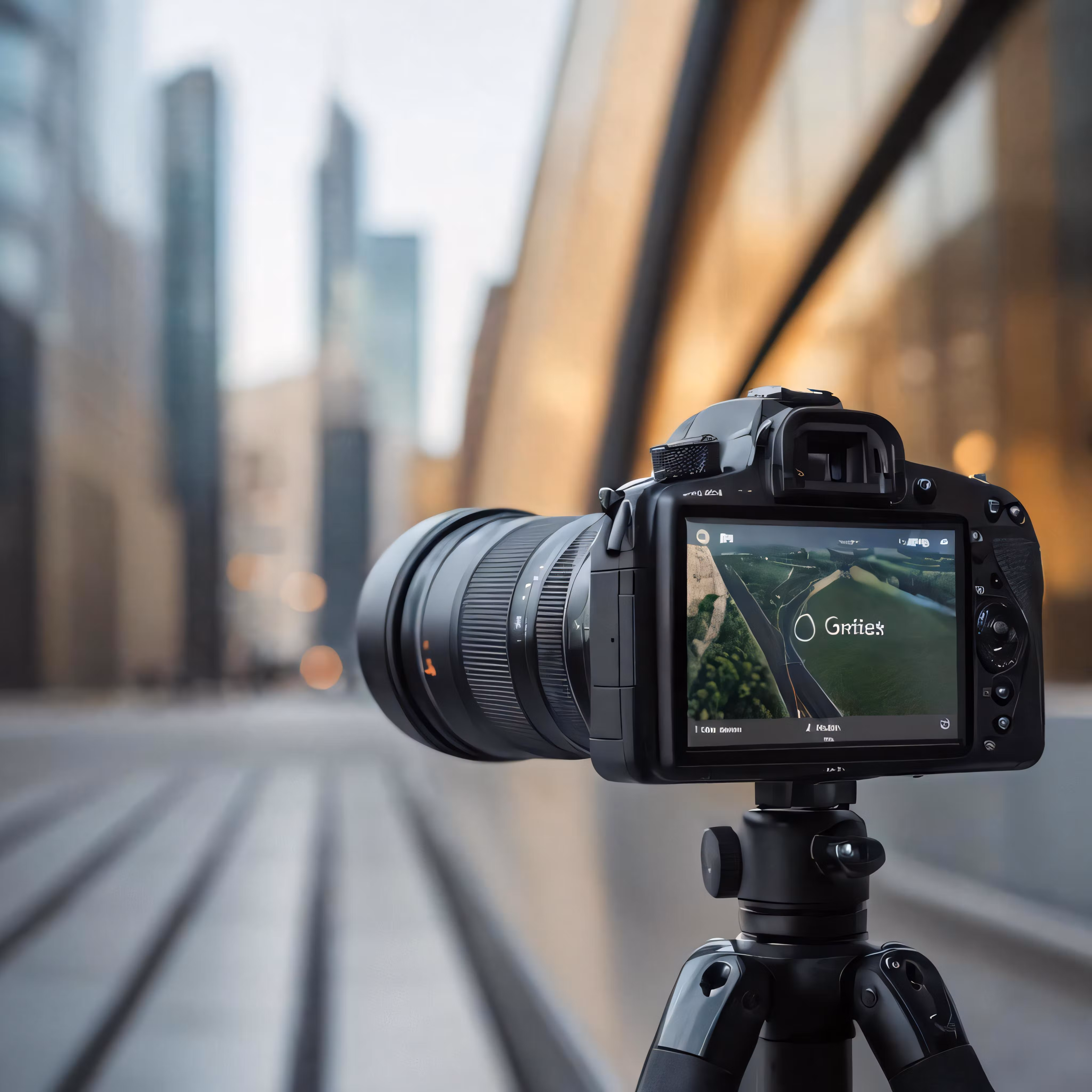 High resolution picture, free to use, camera mounted on tripod looking at city