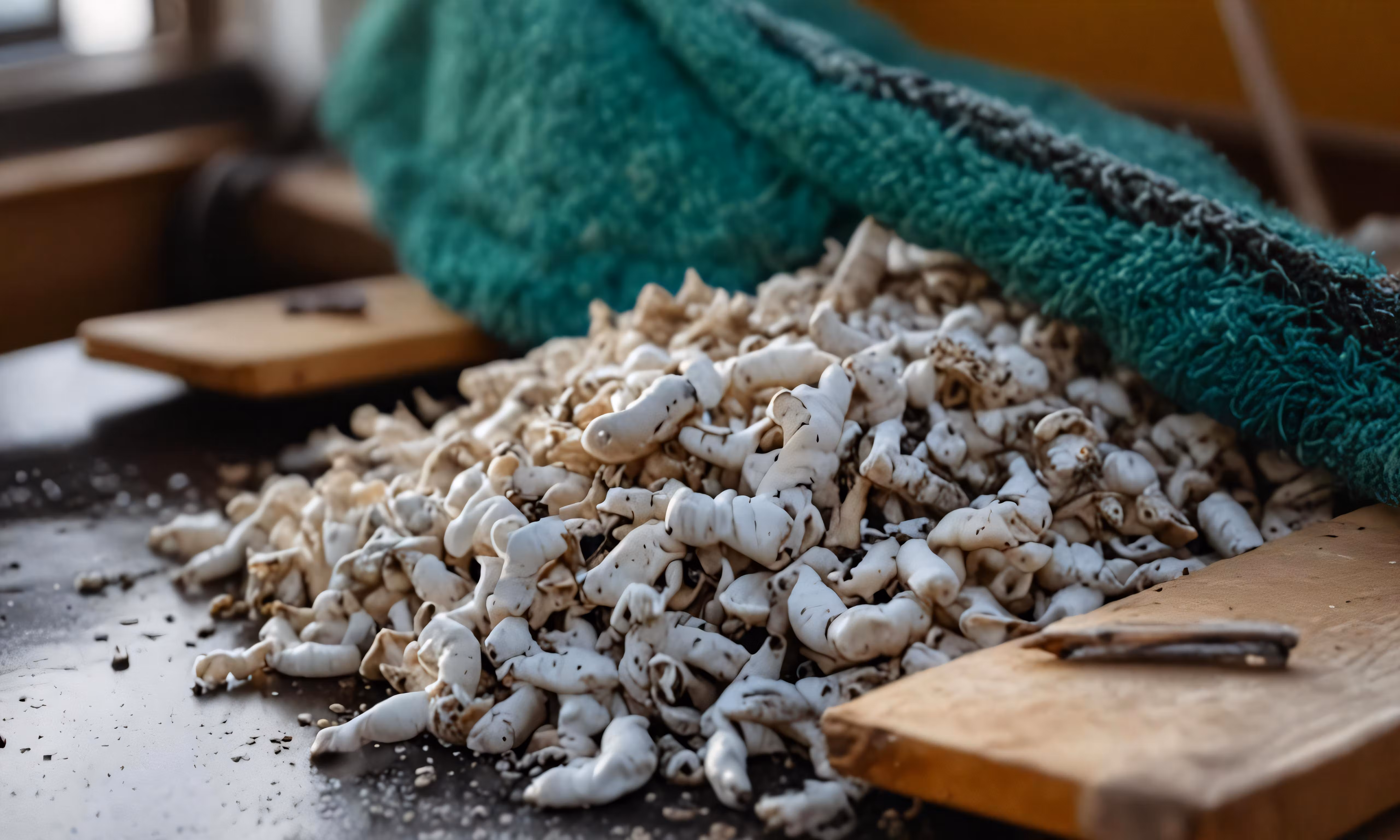 High resolution picture, free to use, clumps of small, white mushrooms on a cutting board
