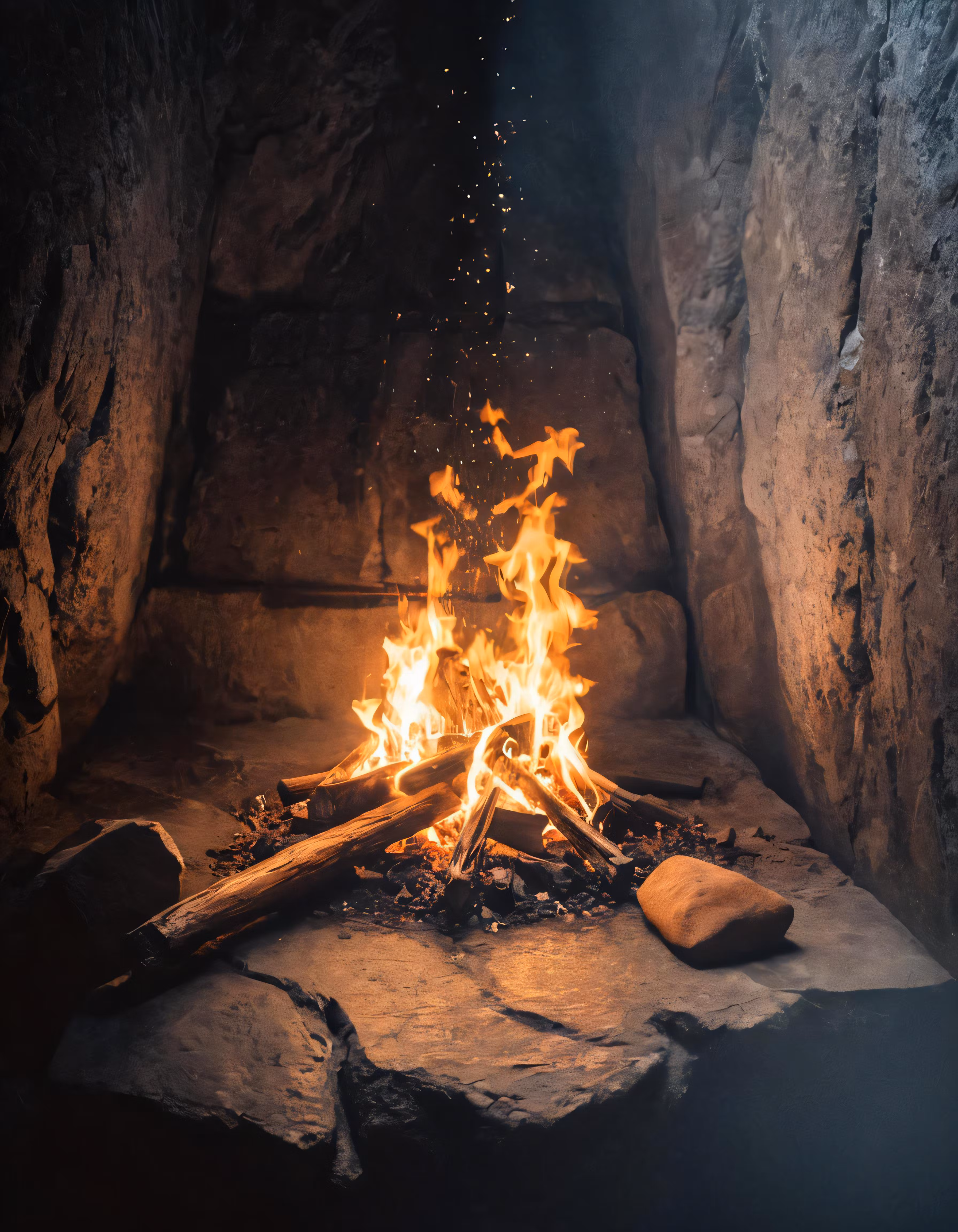 High resolution picture, free to use, fire coming from under a stone cave and set on rocks