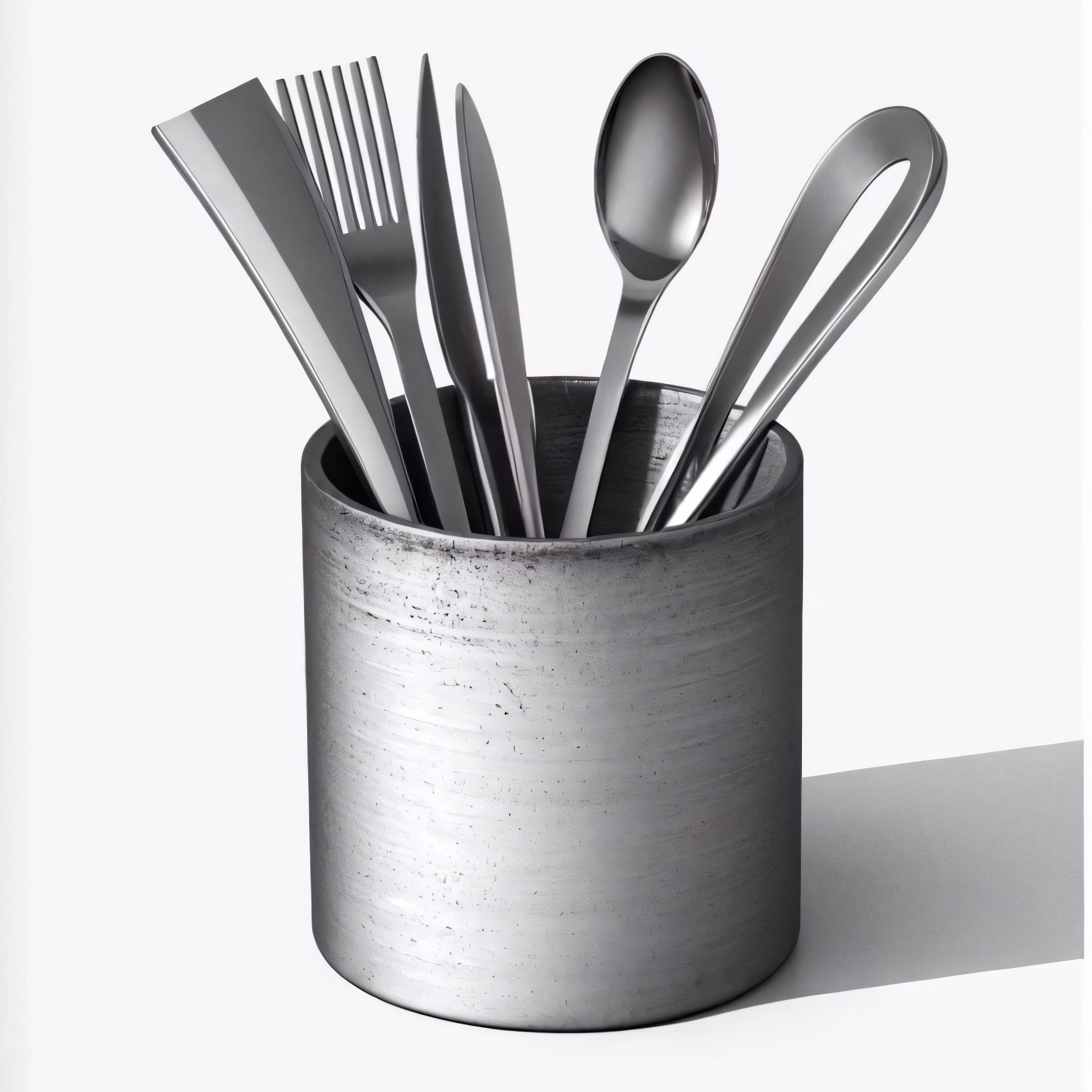 High resolution picture, free to use, forks and spoons sit in an elegantly designed silver cup