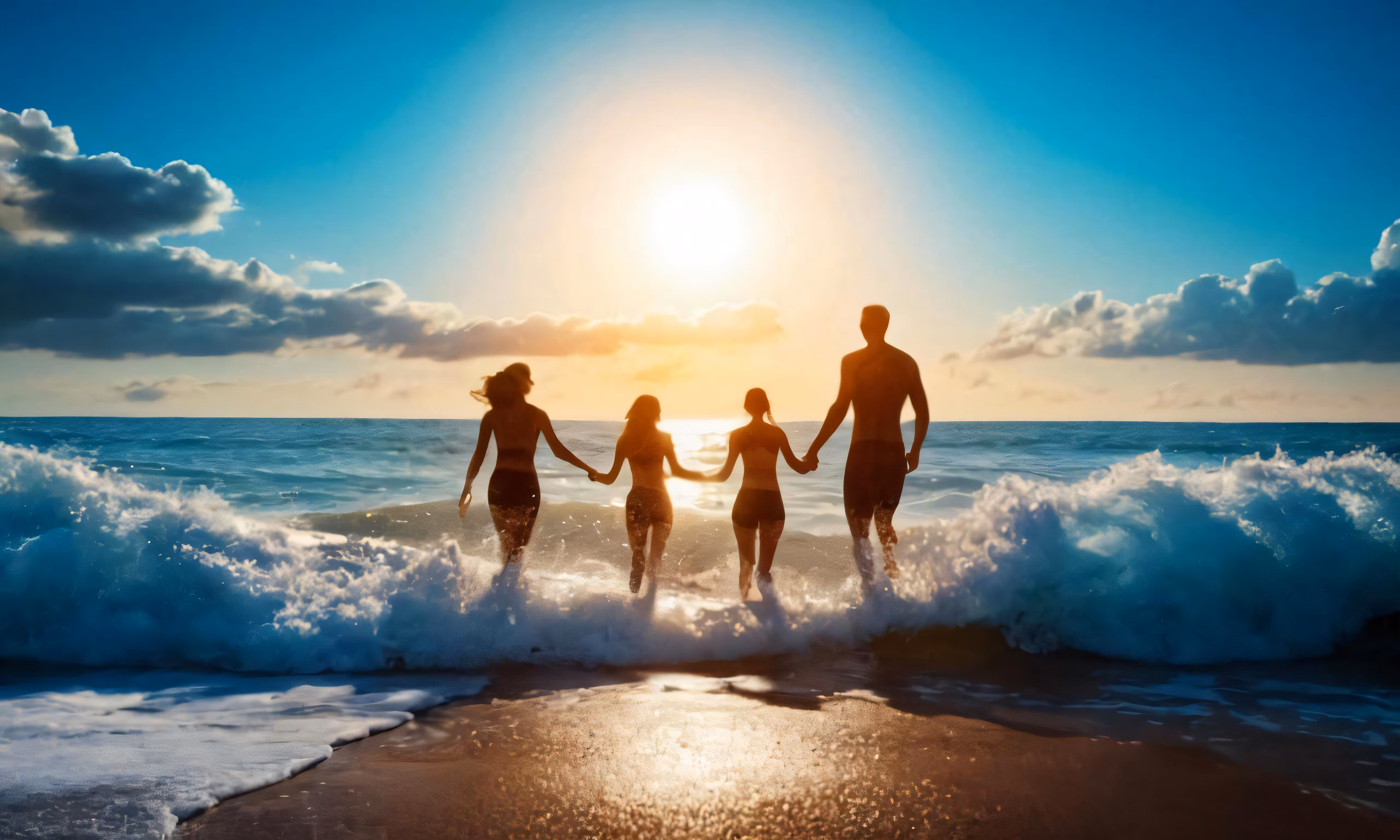 High resolution picture, free to use, four people holding hands walking into the ocean