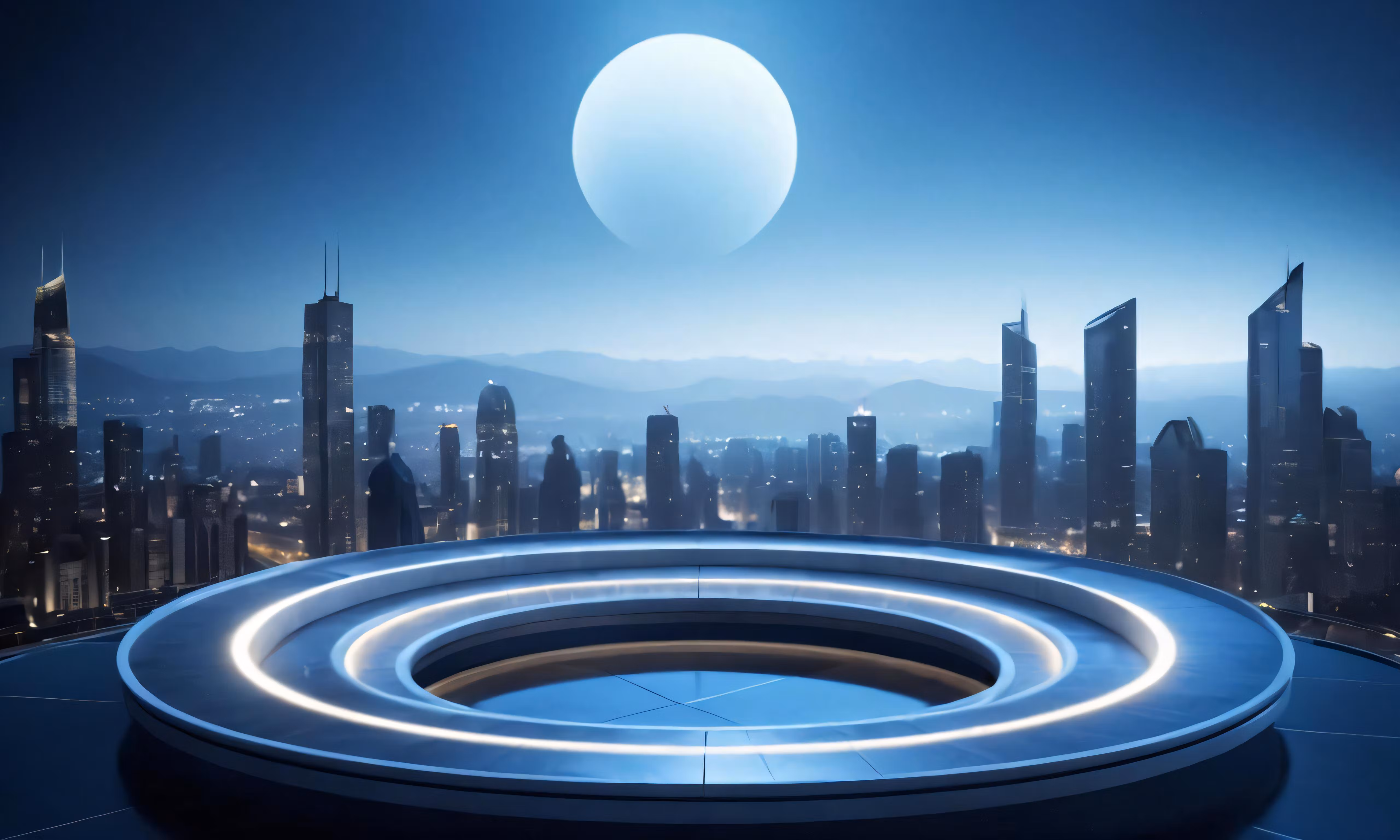 High resolution picture, free to use, futuristic building on the edge of an industrial city at night