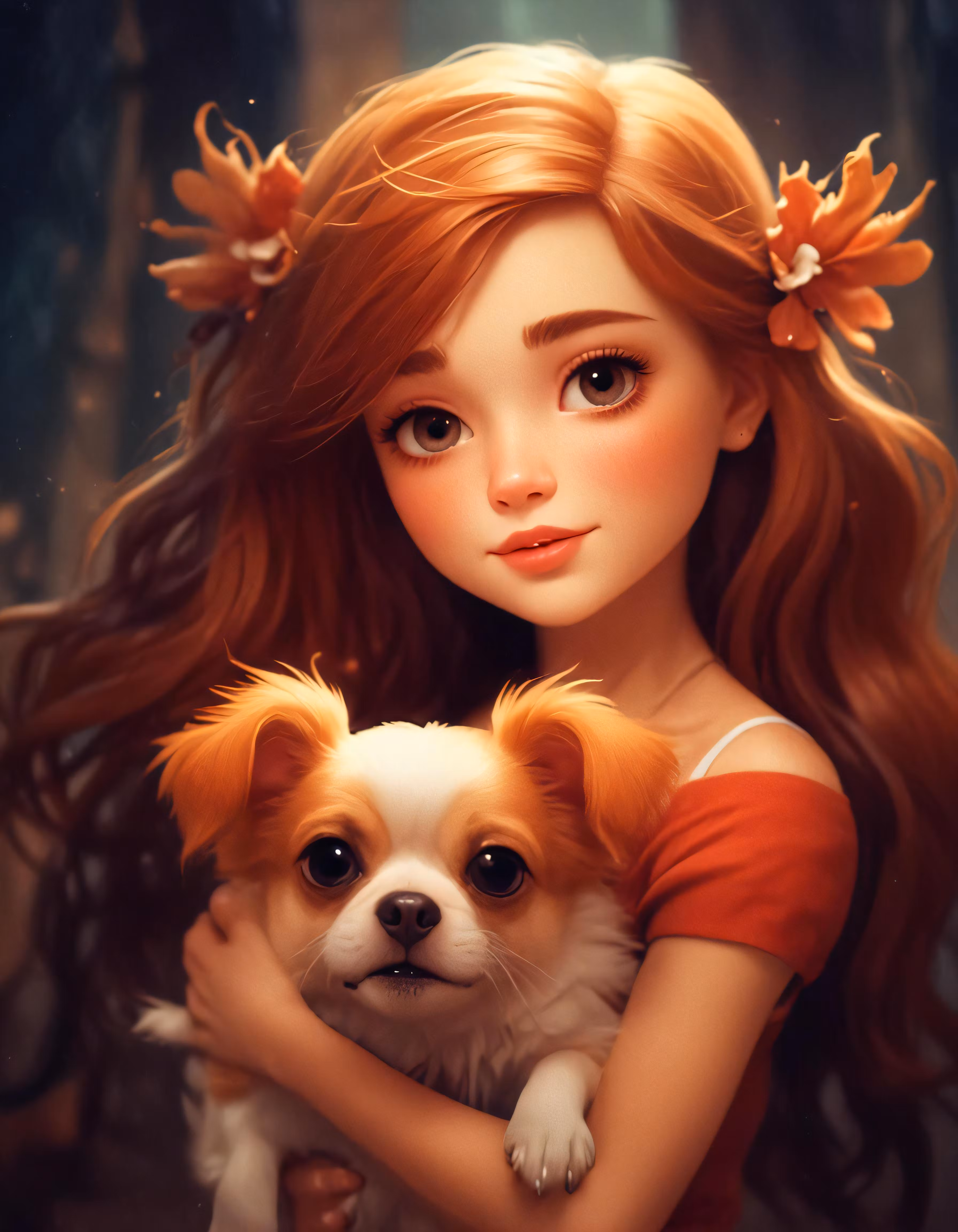 High resolution picture, free to use, girl with dog in her arms with long red hair