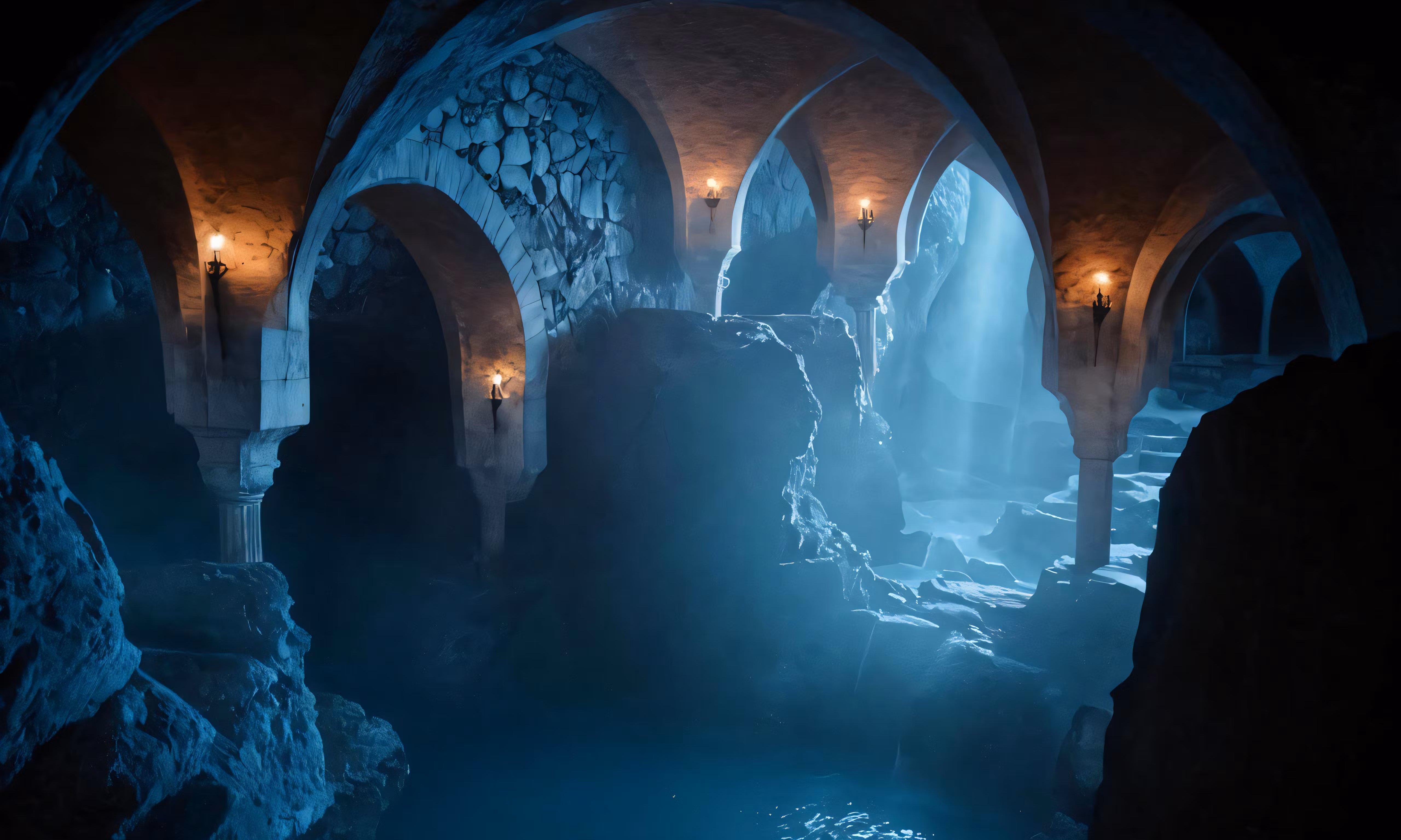 High resolution picture, free to use, inside of a stone cave with lit up rooms