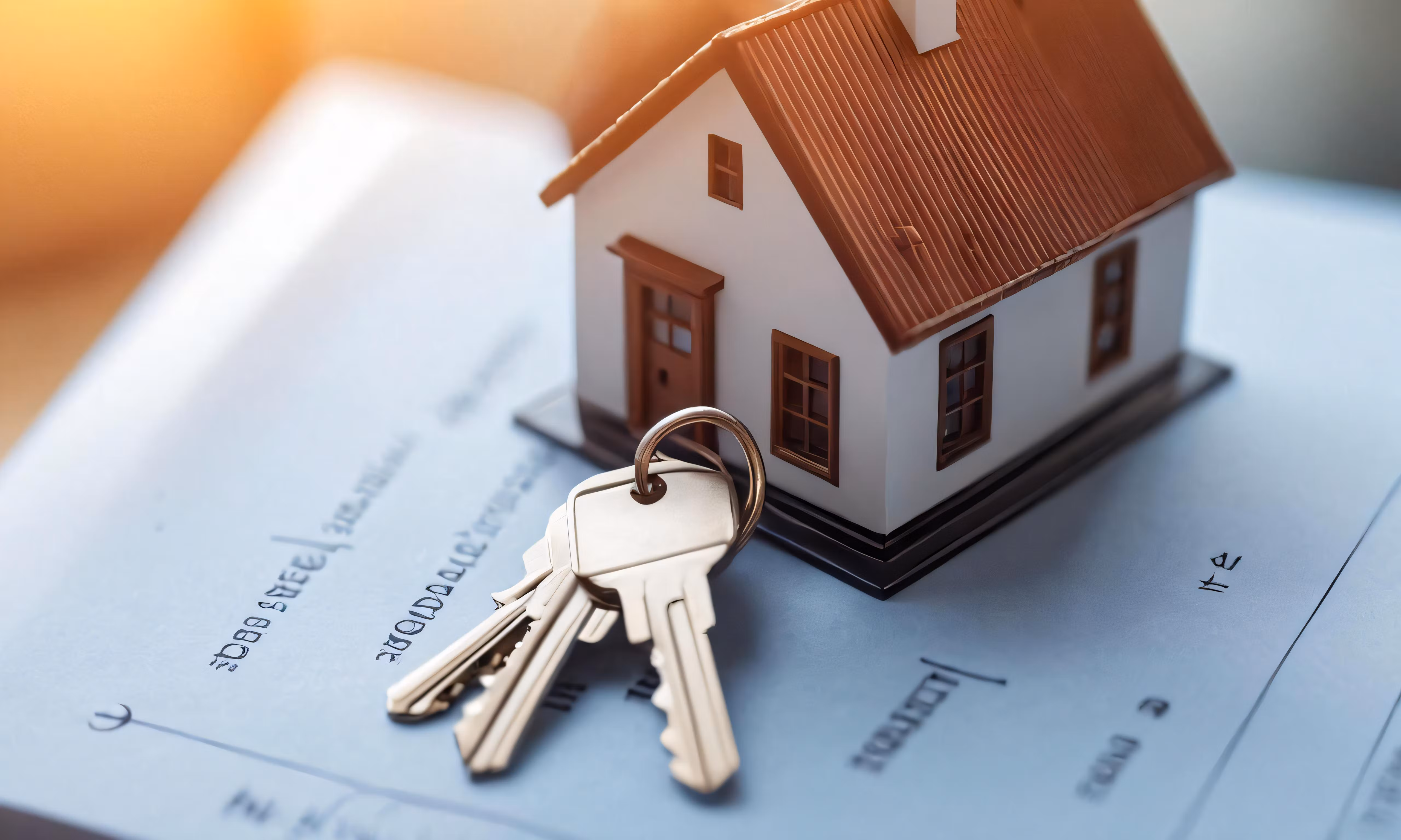 High resolution picture, free to use, keys to a house on top of documents with the sun shining in