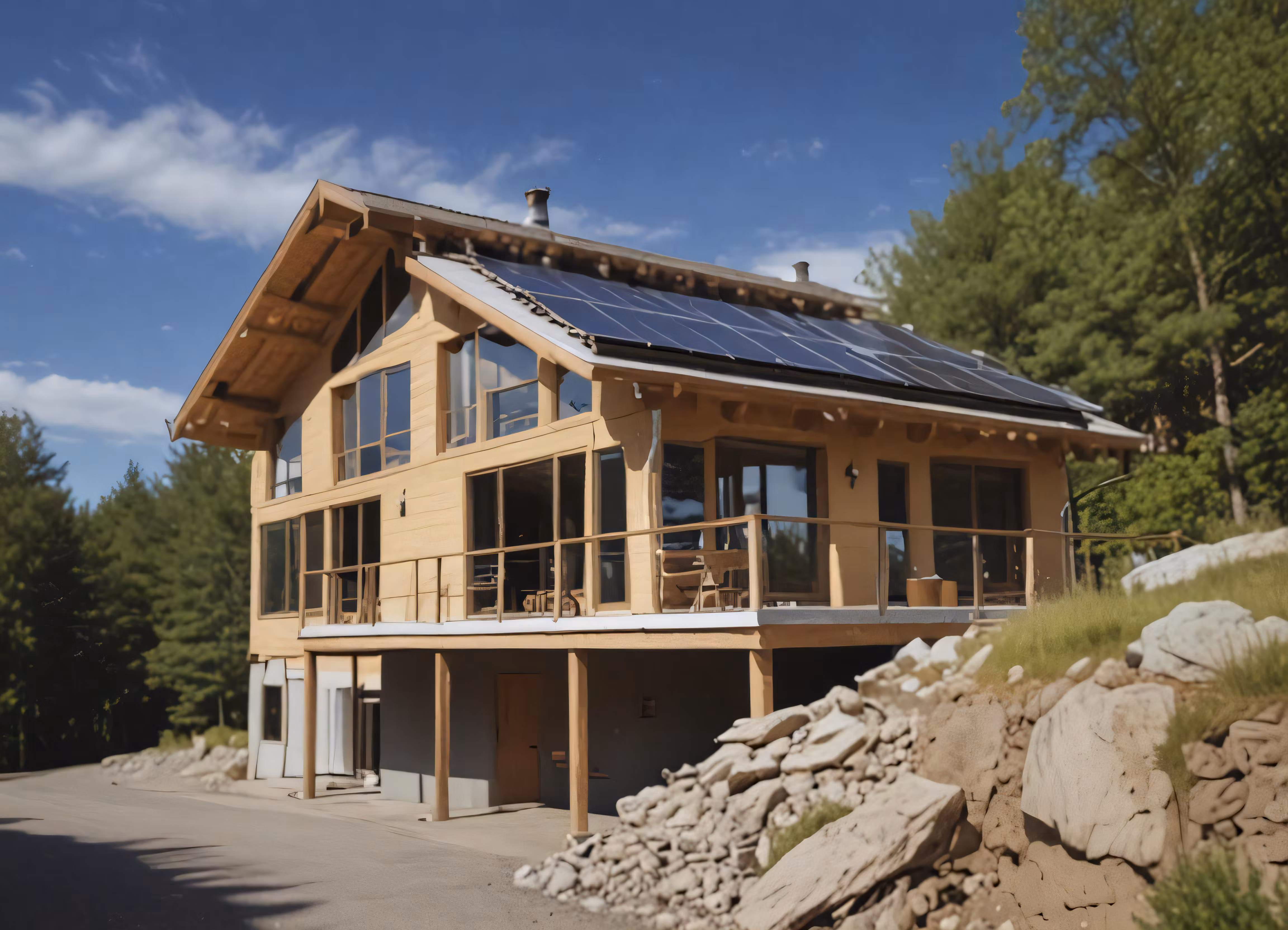 High resolution picture, free to use, large house made of wood, with a solar panel on the roof