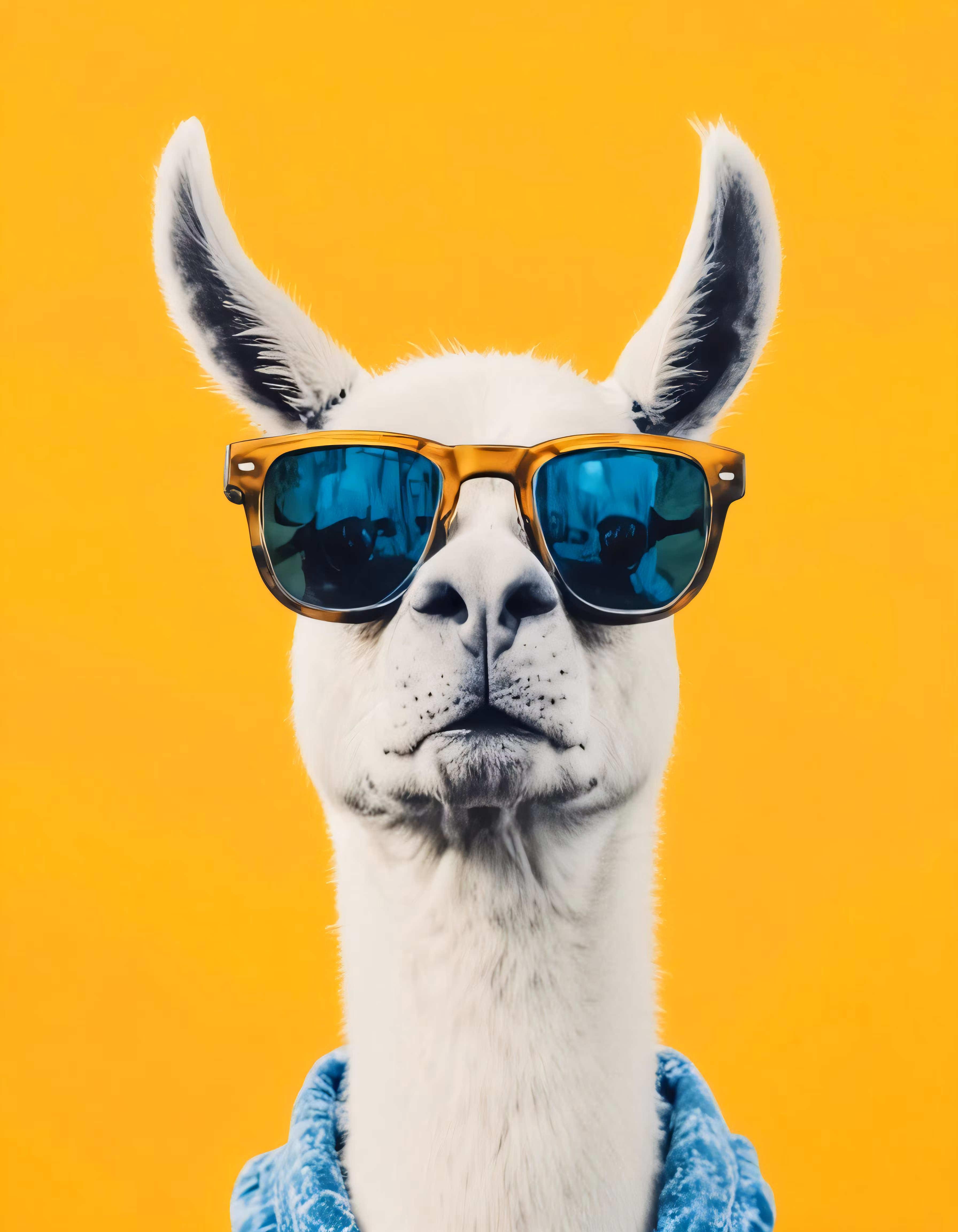 High resolution picture, free to use, llama wearing sunglasses on a yellow background with a blue robe