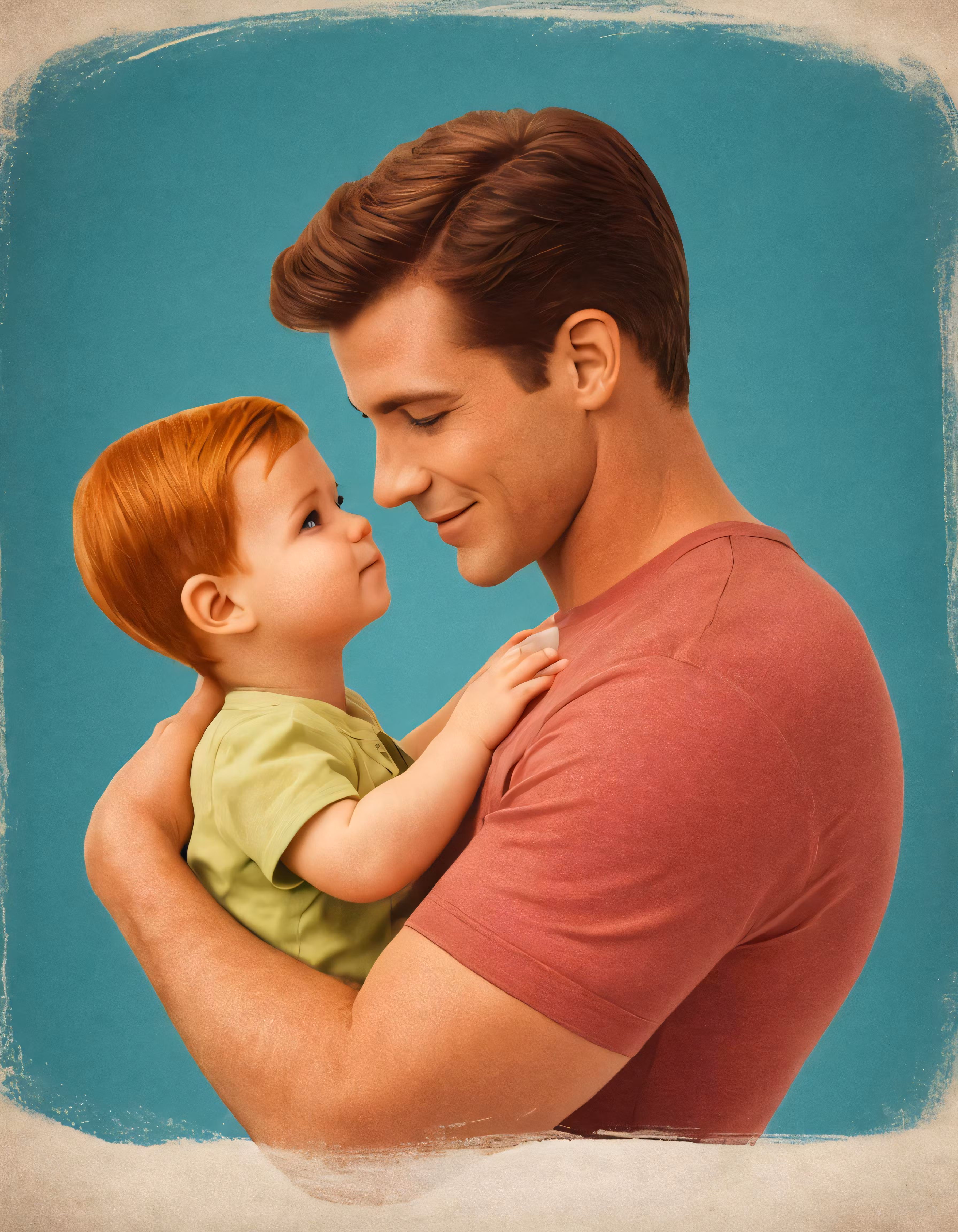 High resolution picture, free to use, man and boy in colored photograph against teal background