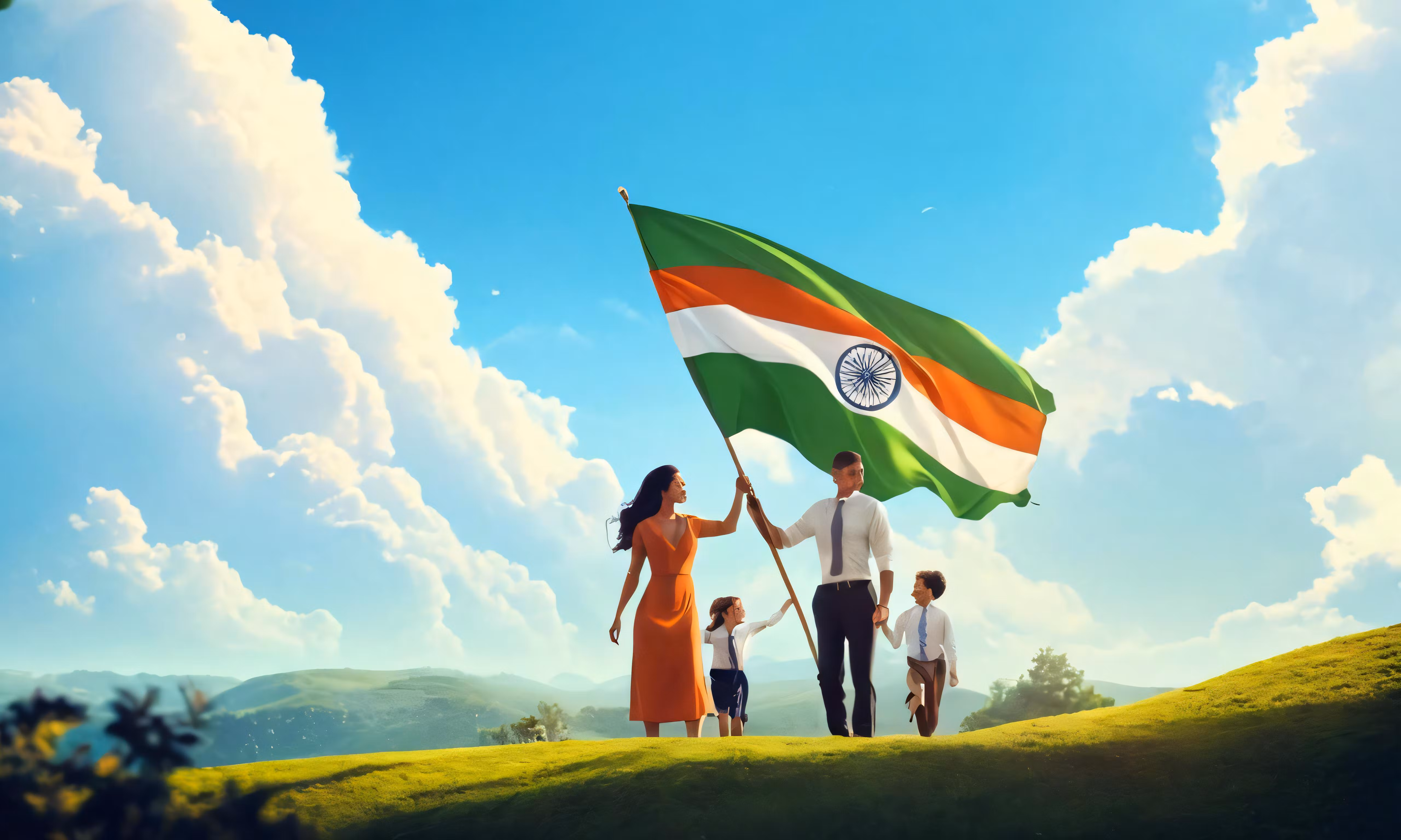 High resolution picture, free to use, man and woman with flag of india crossing field holding