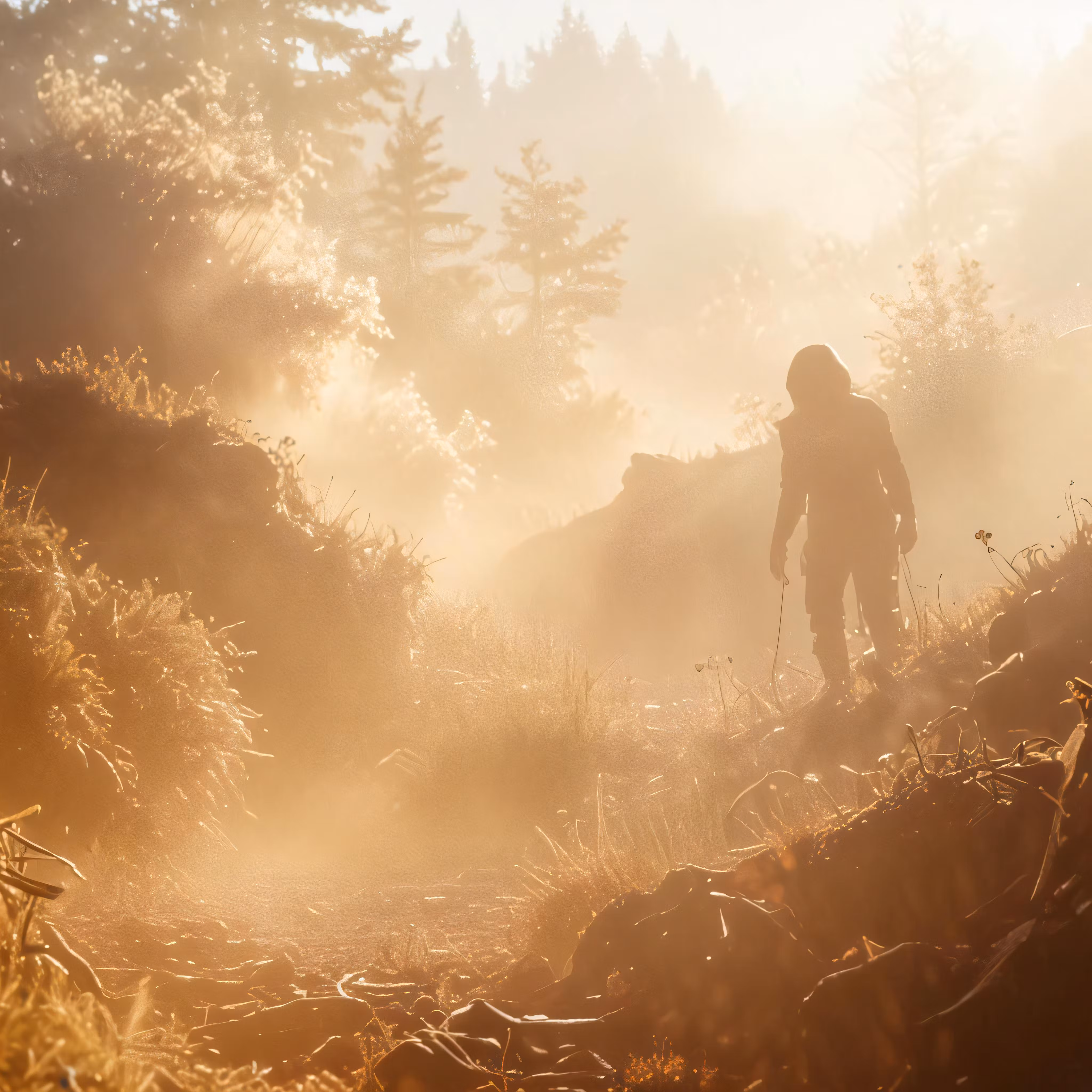 High resolution picture, free to use, man hiking through tall grass on a foggy day