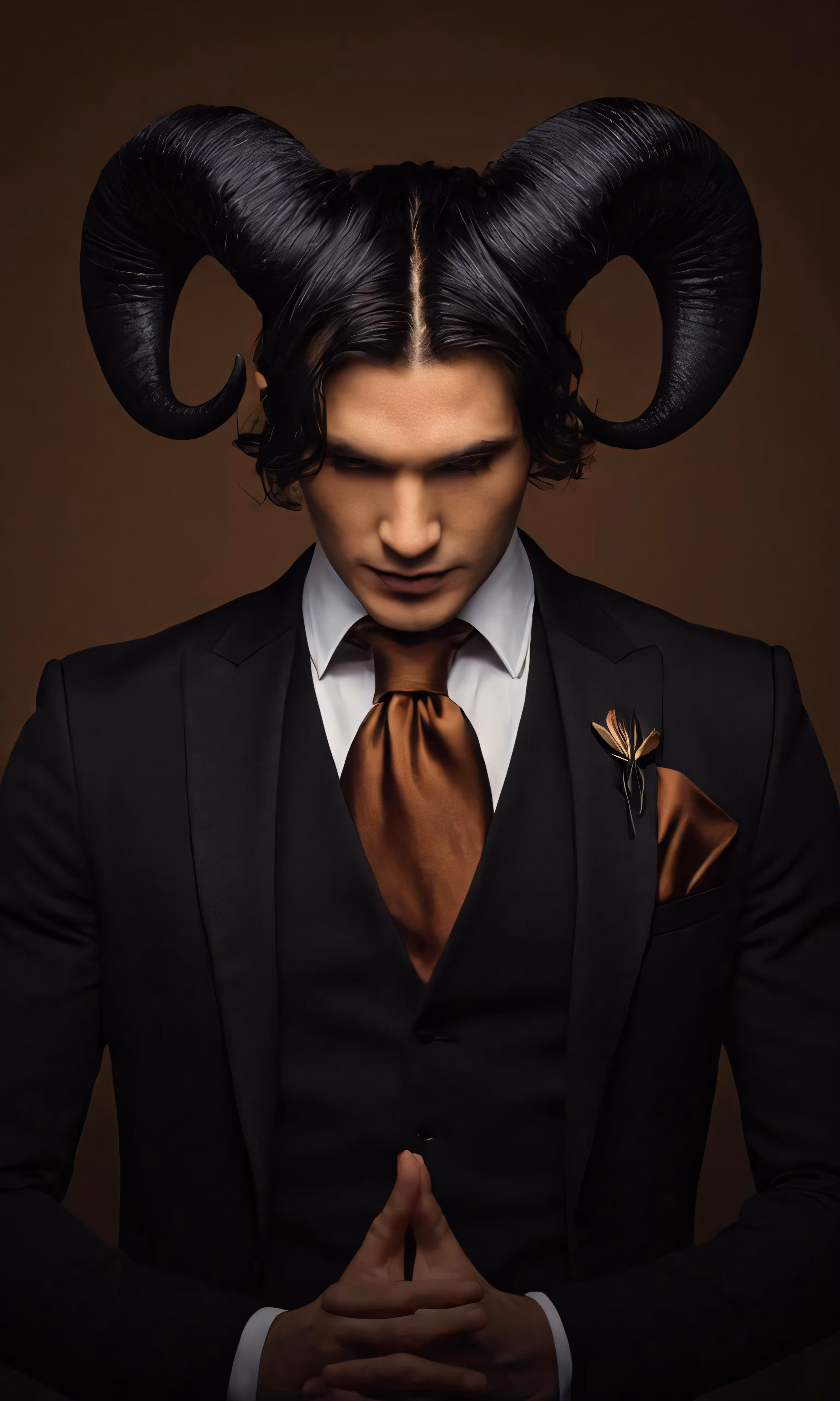 High resolution picture, free to use, man in black suit with horns on his head and tie