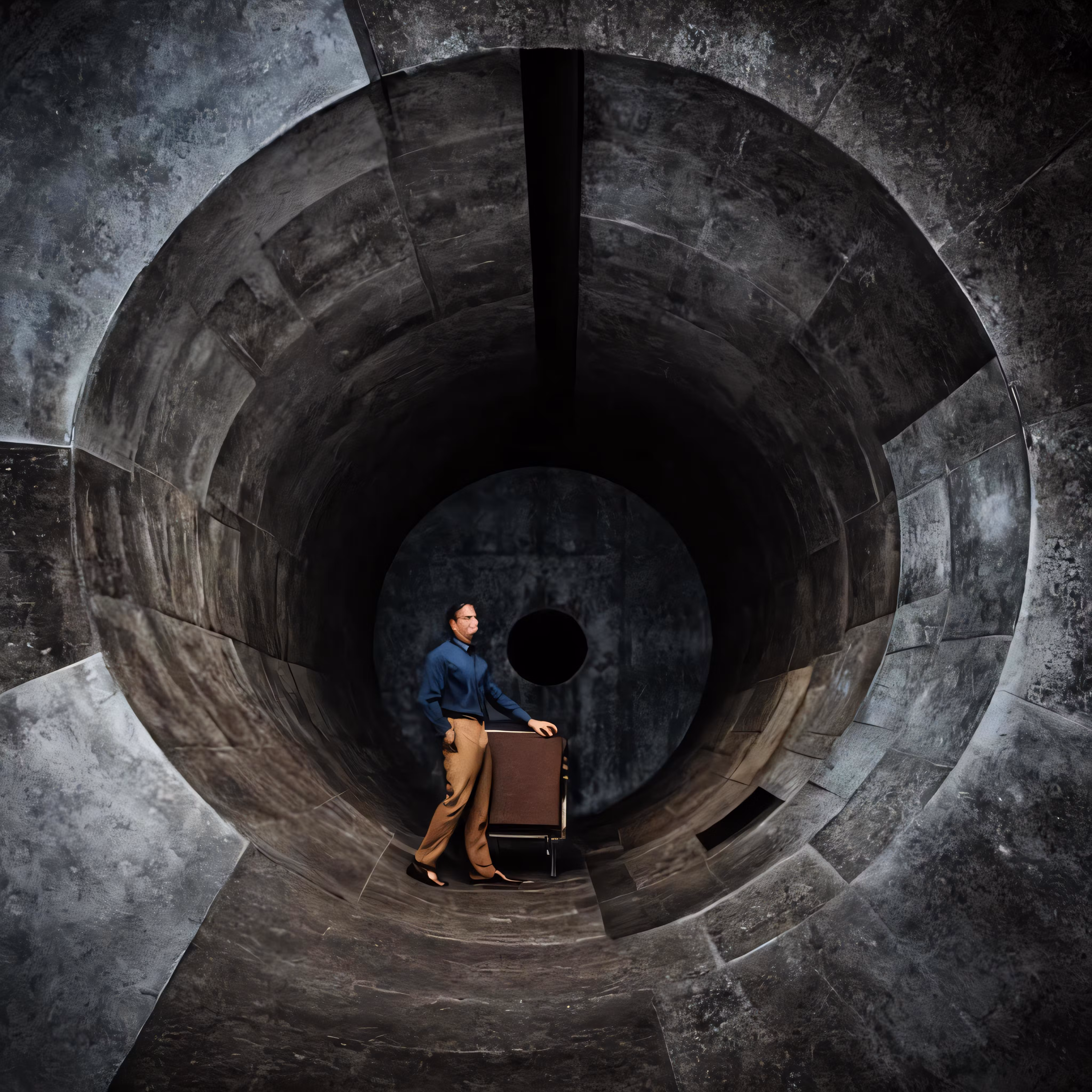 High resolution picture, free to use, man in blue shirt and tan pants walking through a large pipe