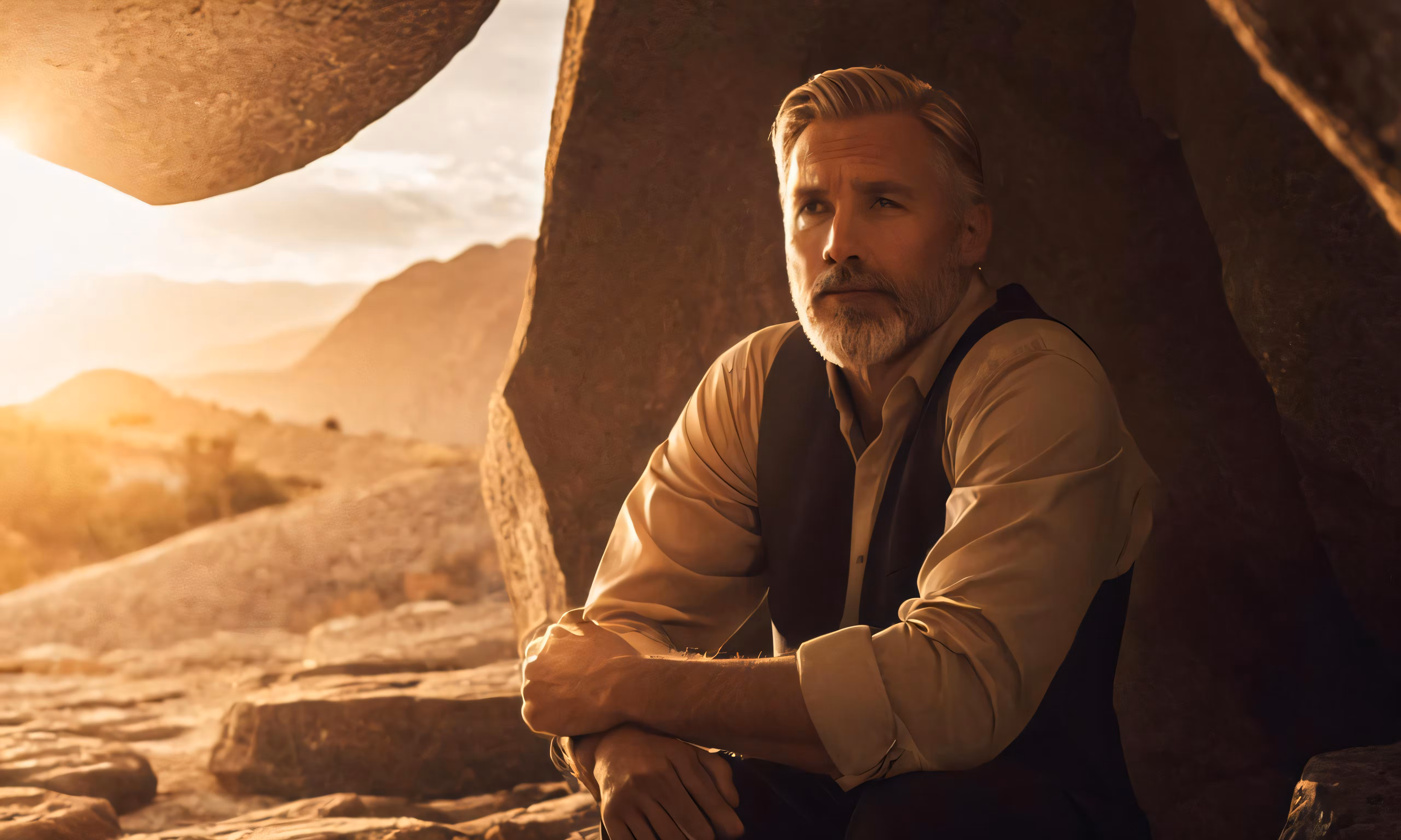 High resolution picture, free to use, man sitting in the desert by some big rocks