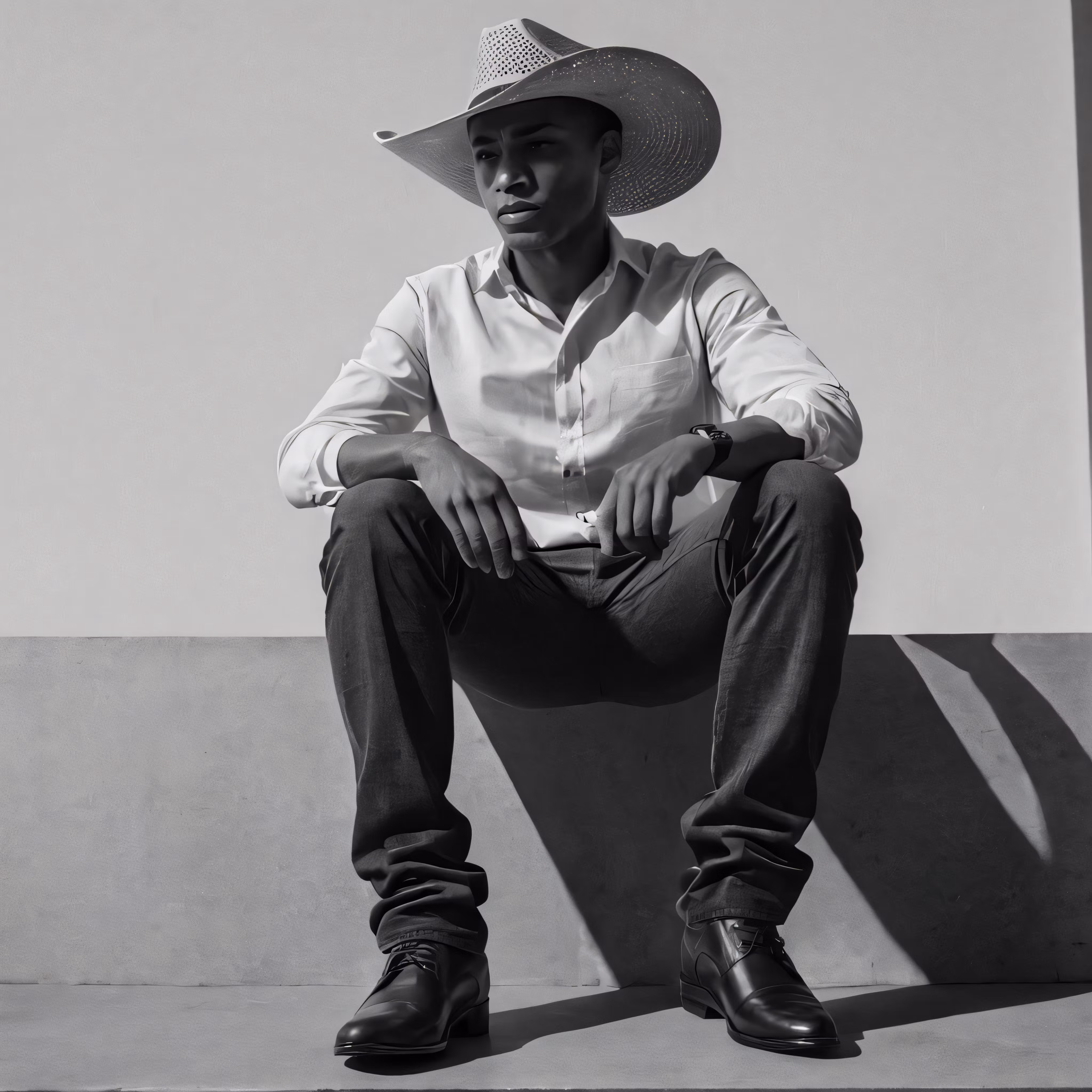 High resolution picture, free to use, man sitting on a ledge wearing cowboy hat and jeans