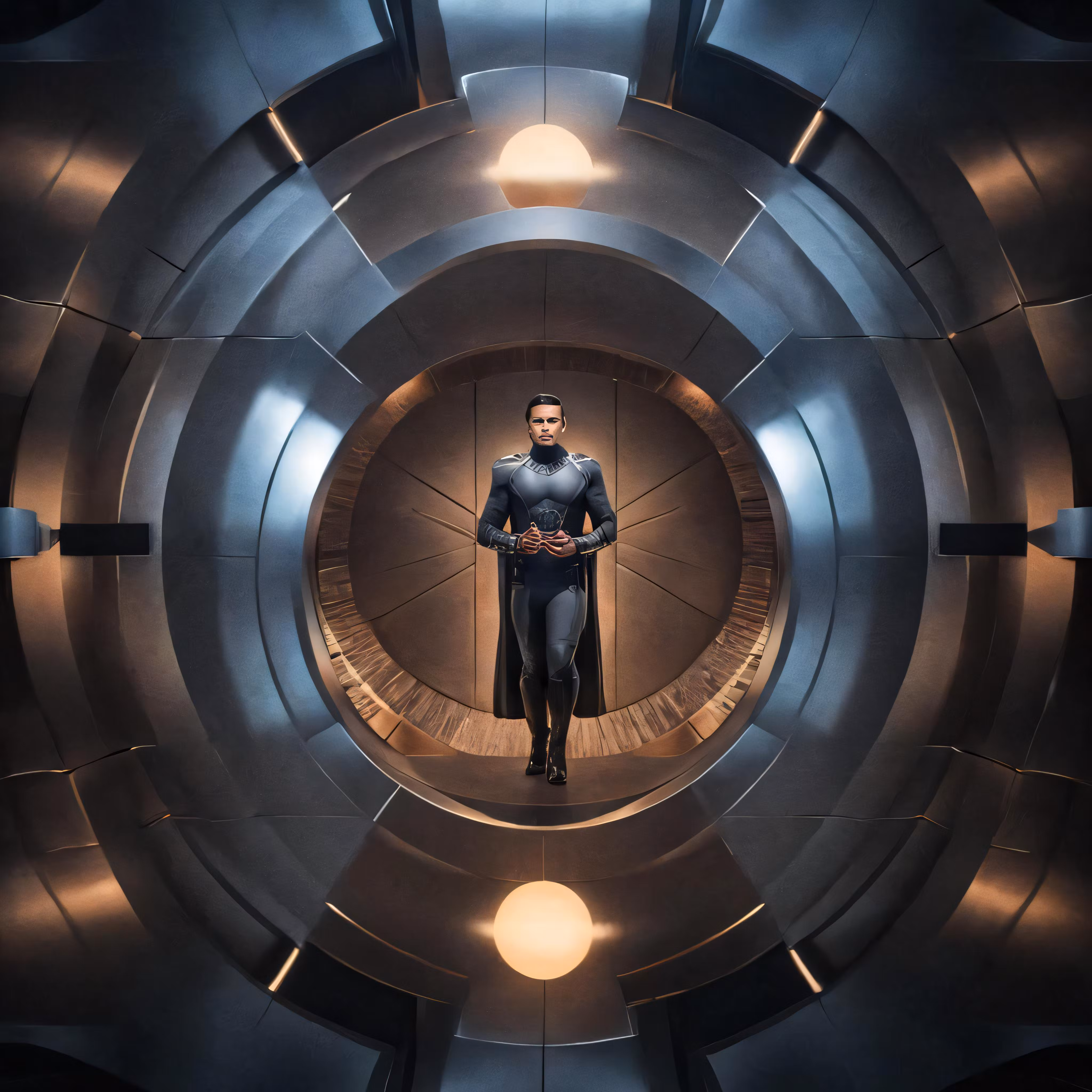High resolution picture, free to use, man standing inside large metal circular space with lights