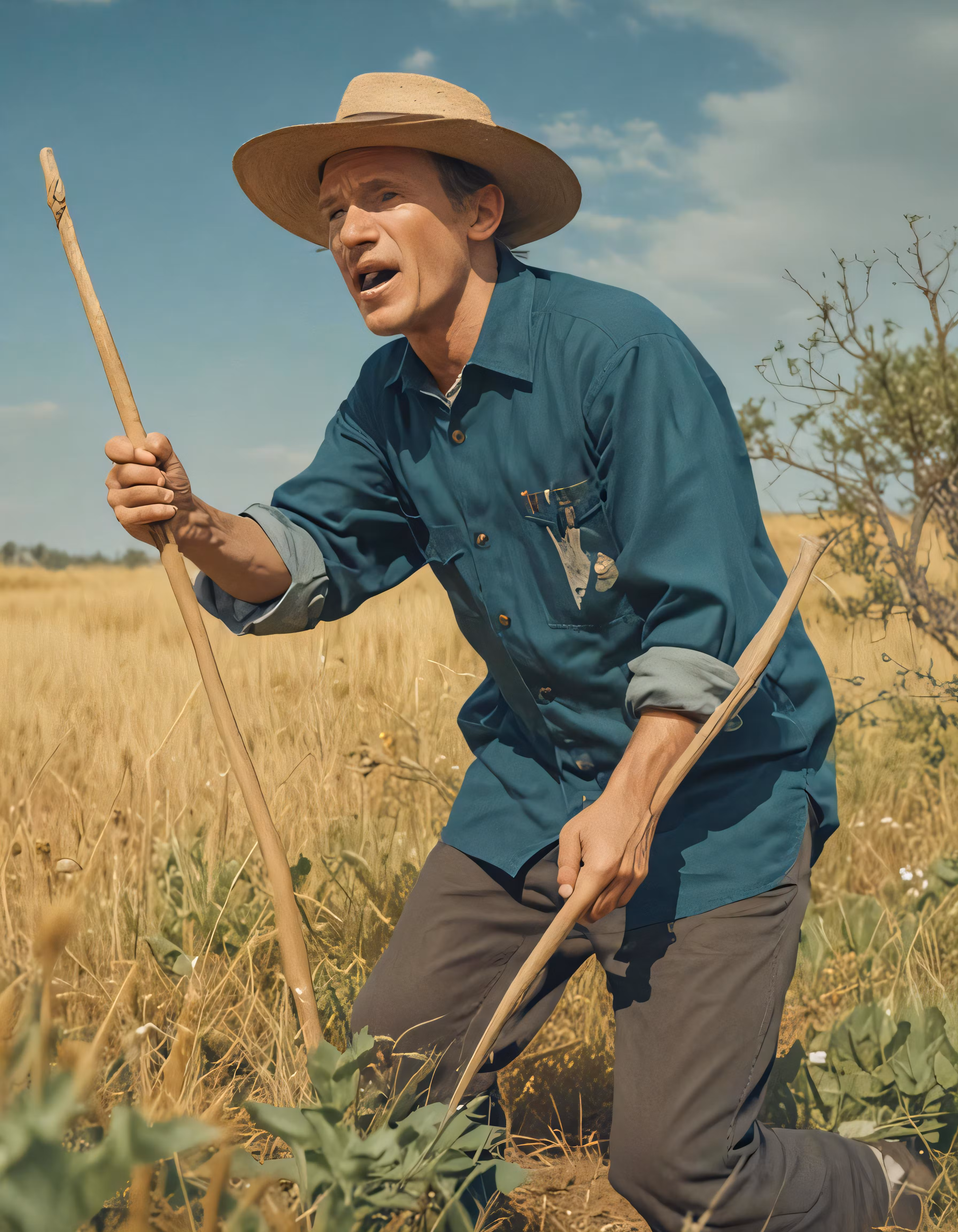 High resolution picture, free to use, man with two canes kneeling in tall grass