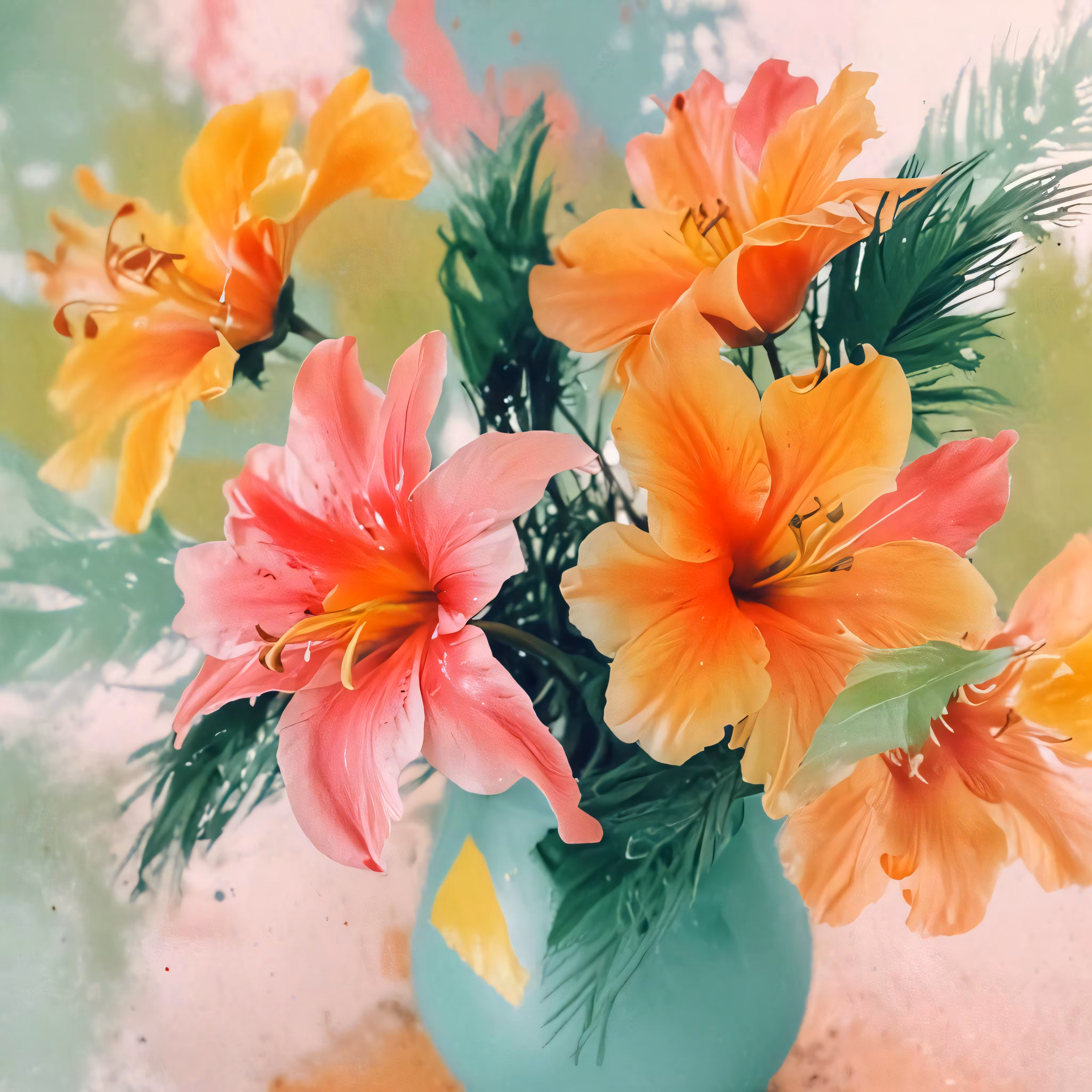 High resolution picture, free to use, orange and pink flowers in a vase on a table