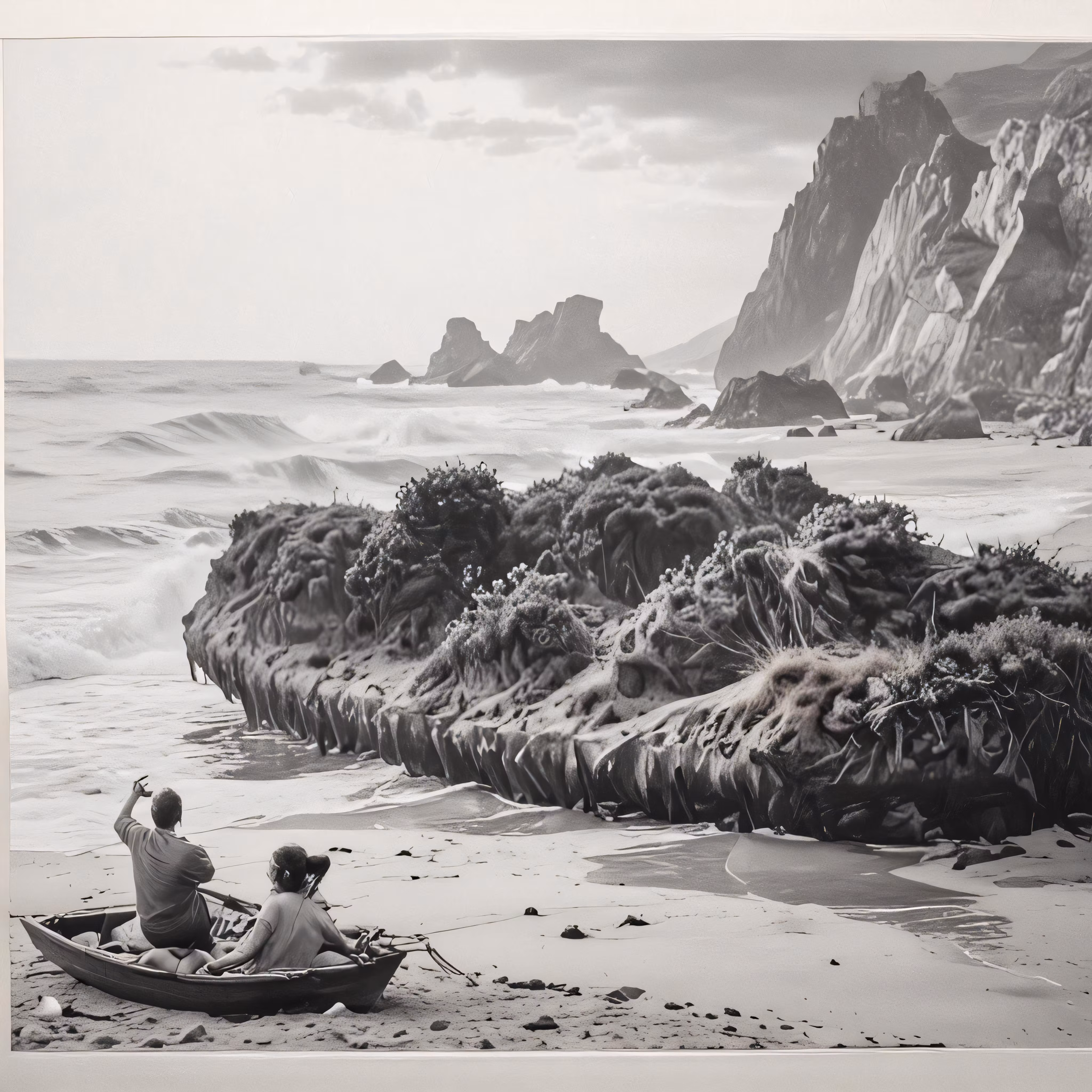 High resolution picture, free to use, people in a small boat with trees on the beach