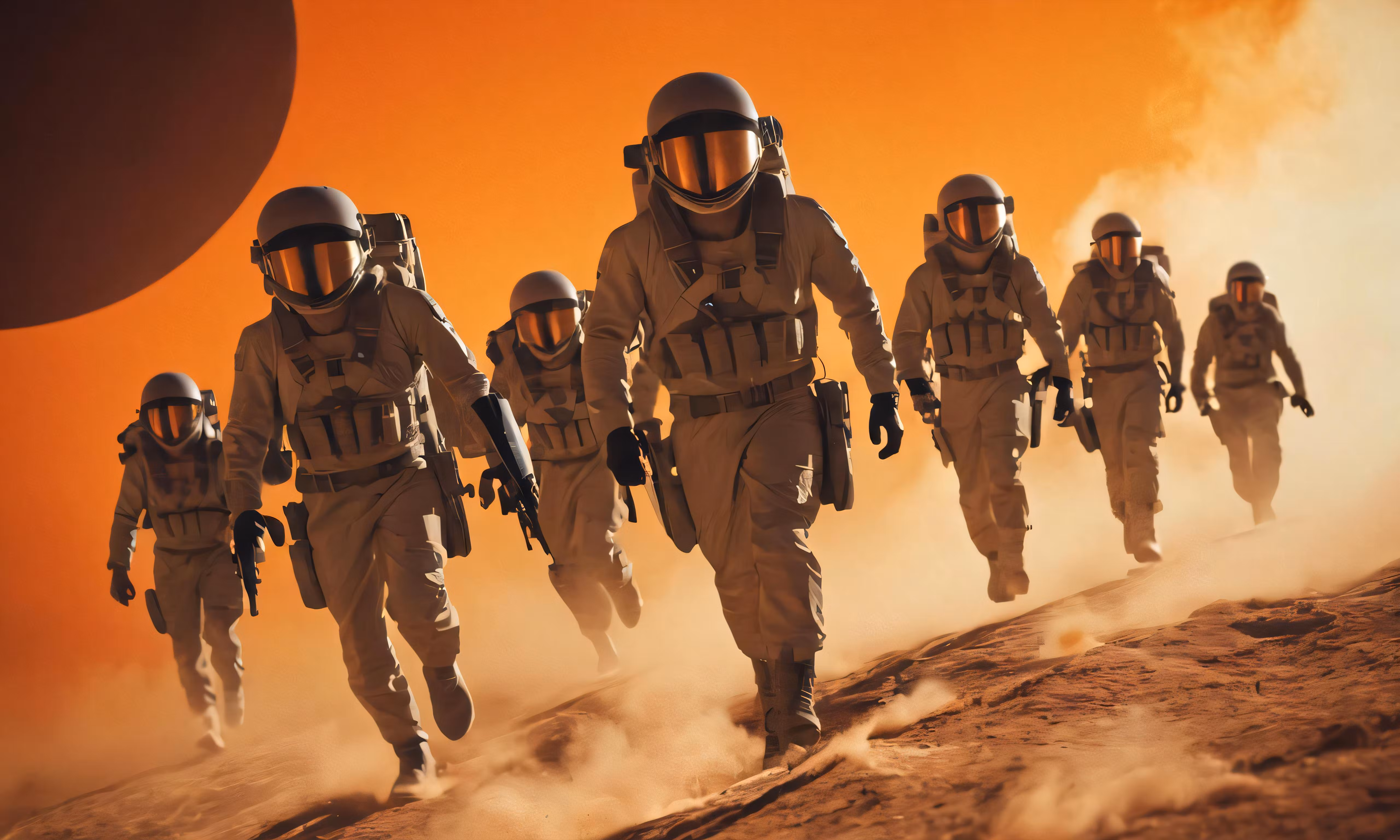 High resolution picture, free to use, people in space suits are walking on a desert plain