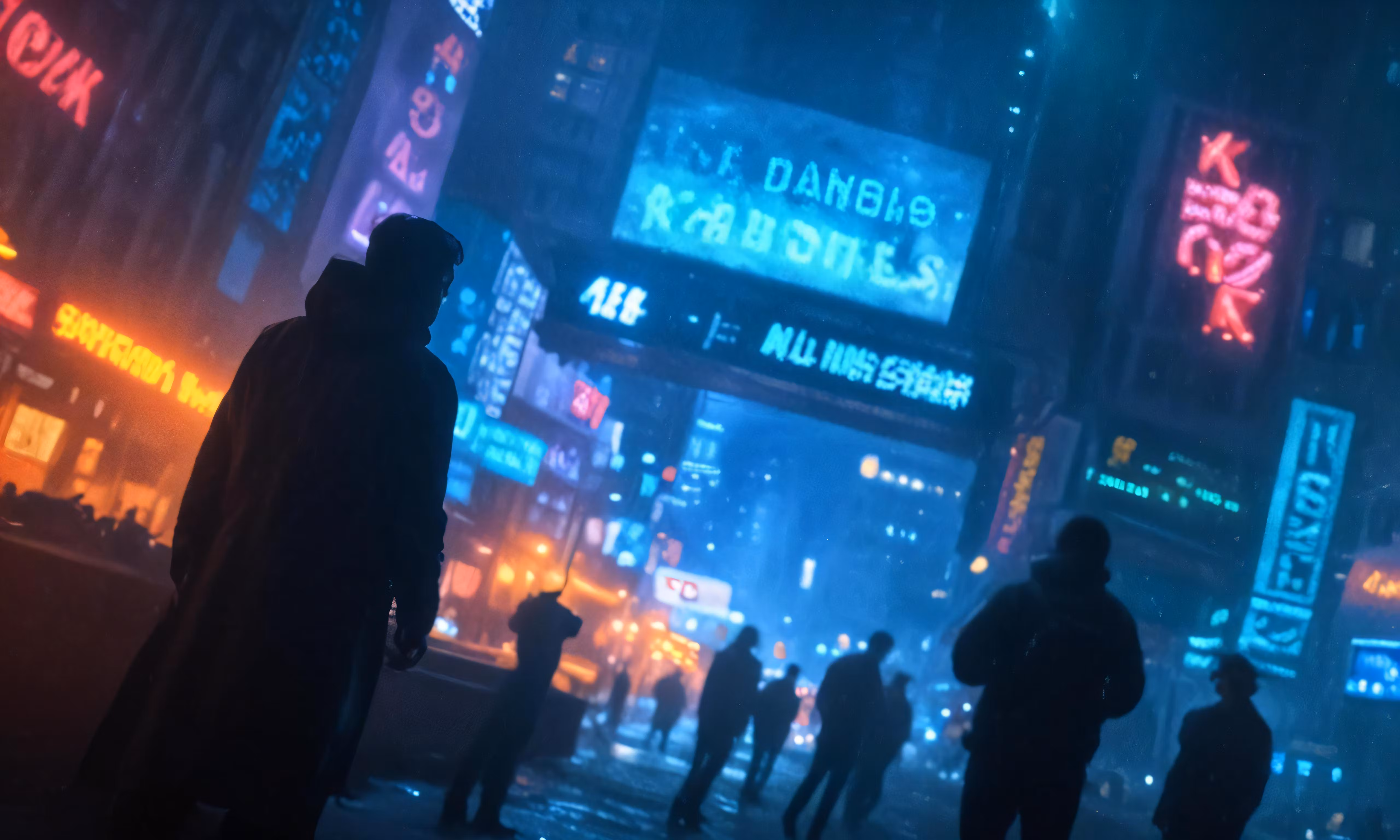 High resolution picture, free to use, people stand at night in the city on a foggy street