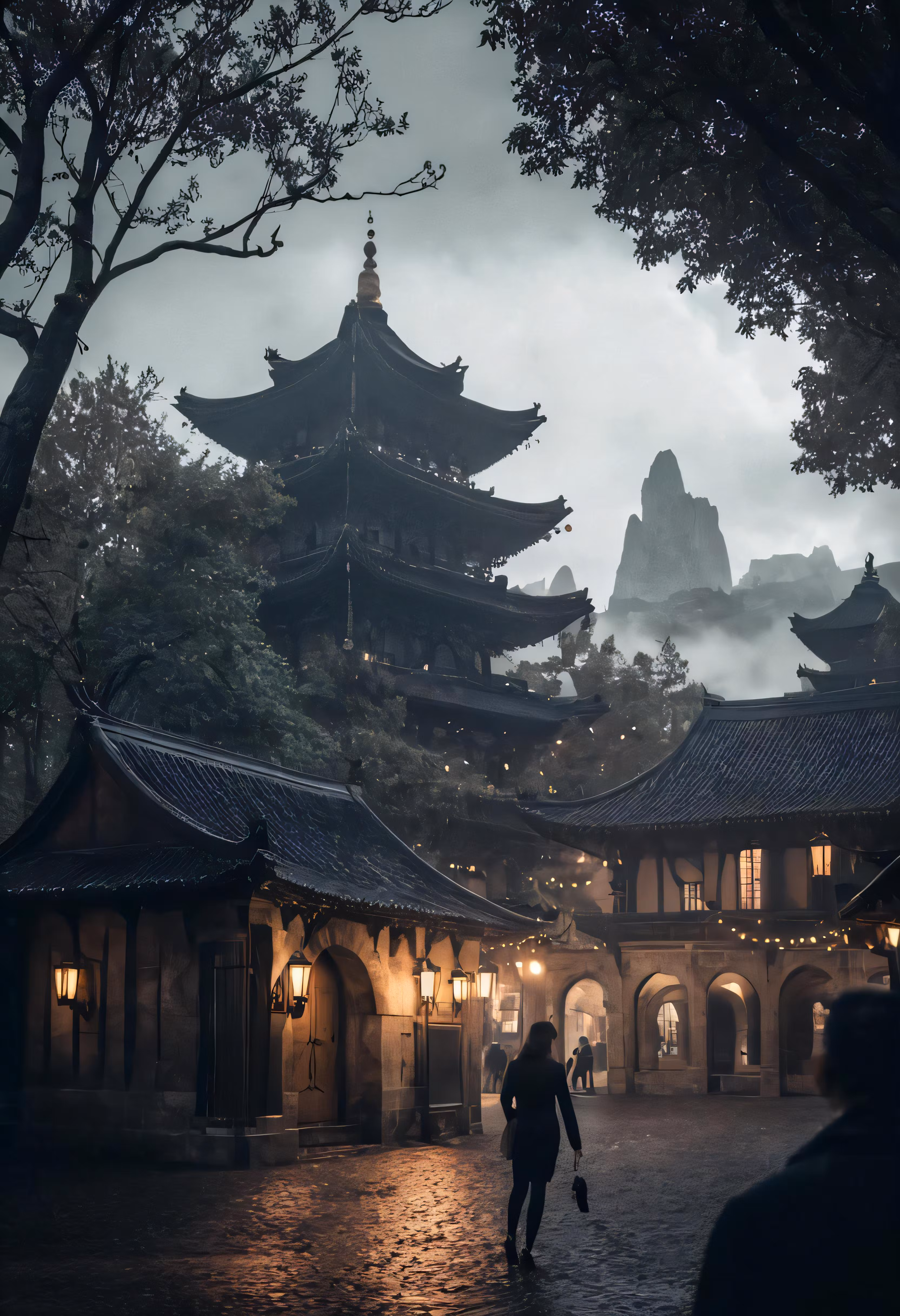 High resolution picture, free to use, people walk past an asian style building on a rainy day