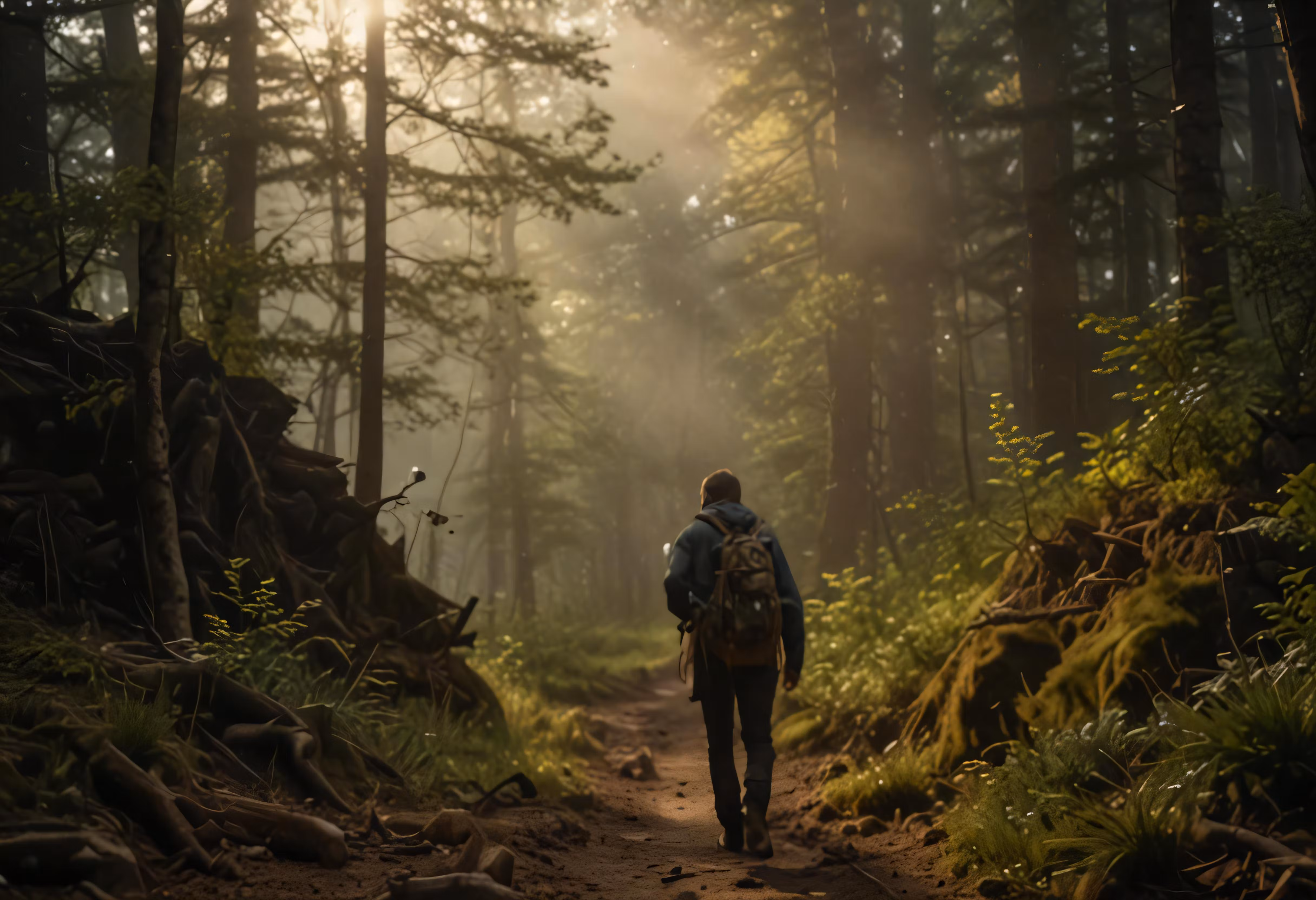 High resolution picture, free to use, person walking along trail with backpack in forest area