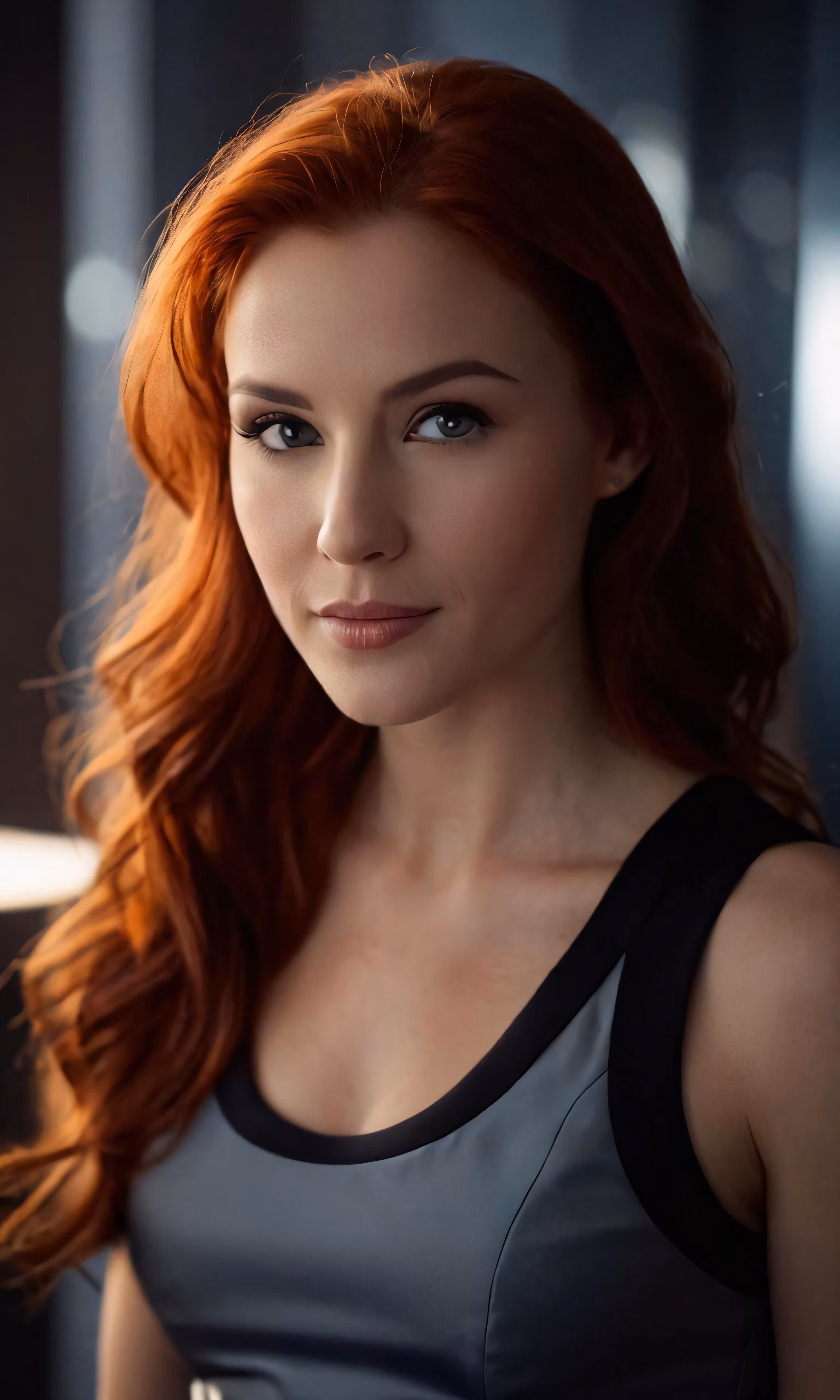 High resolution picture, free to use, red headed woman looking at camera in black tank top
