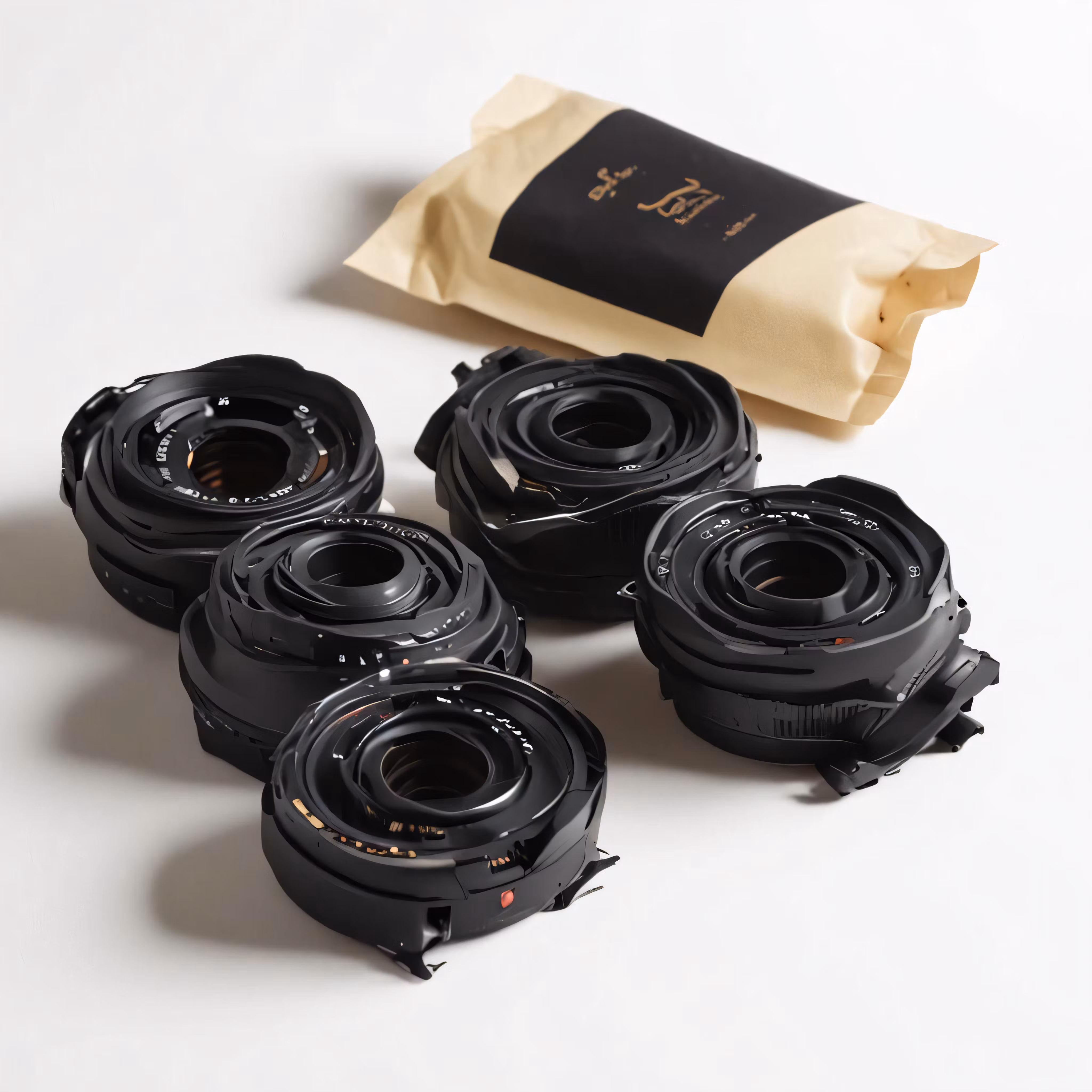High resolution picture, free to use, several black camera lenses sit on top of the same lens