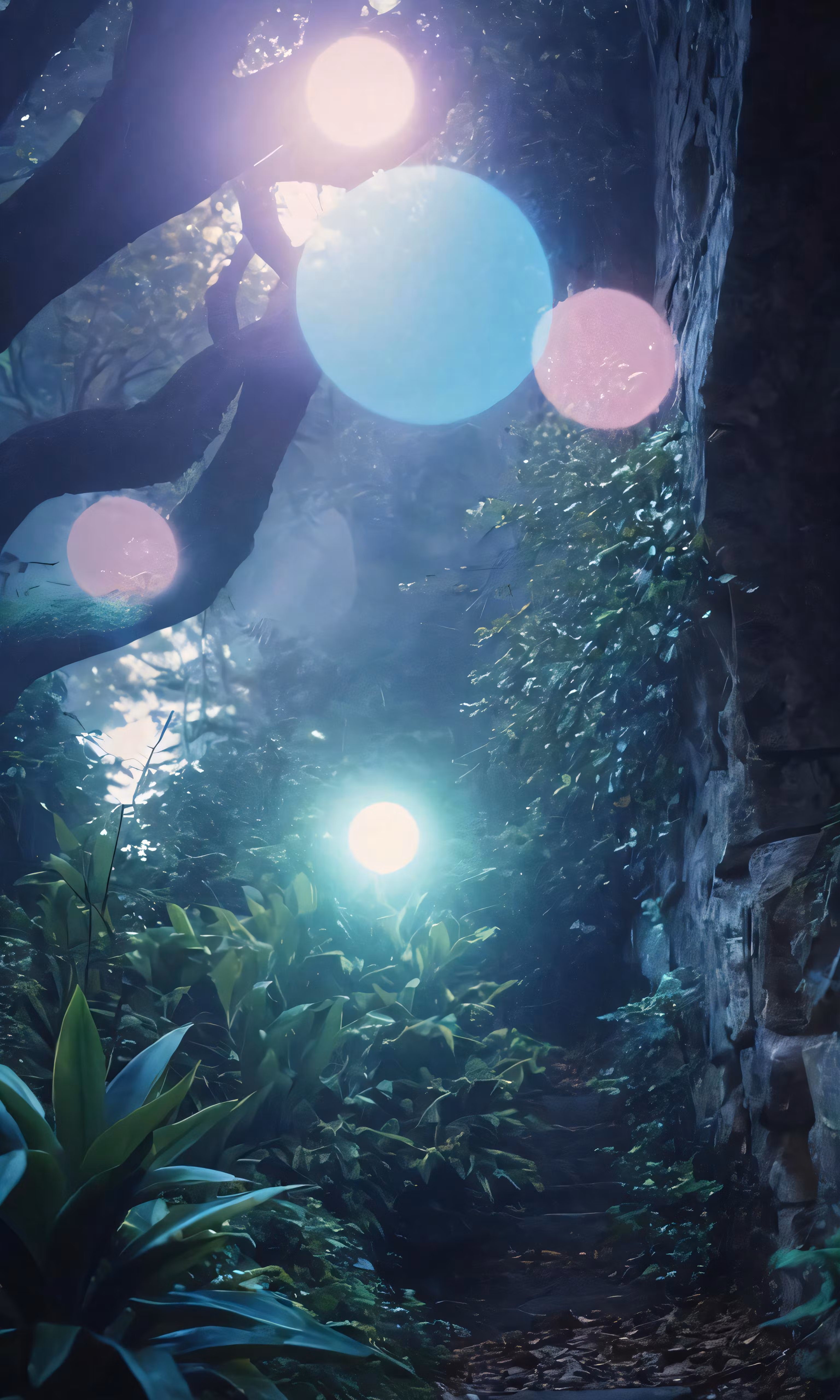 High resolution picture, free to use, several bright lights shine from an archway into a lush green forest