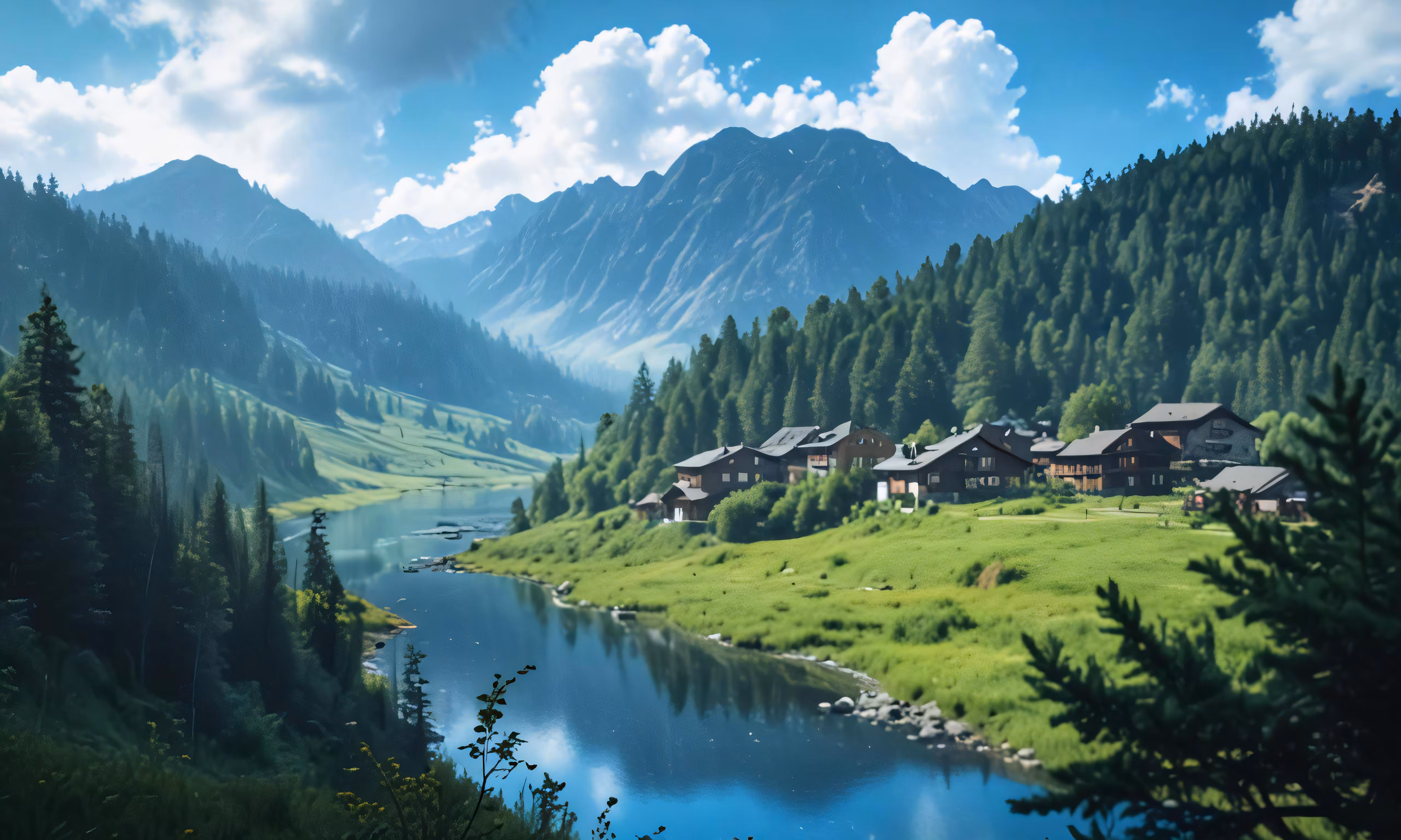 High resolution picture, free to use, several houses are in the background while a beautiful river flows through it