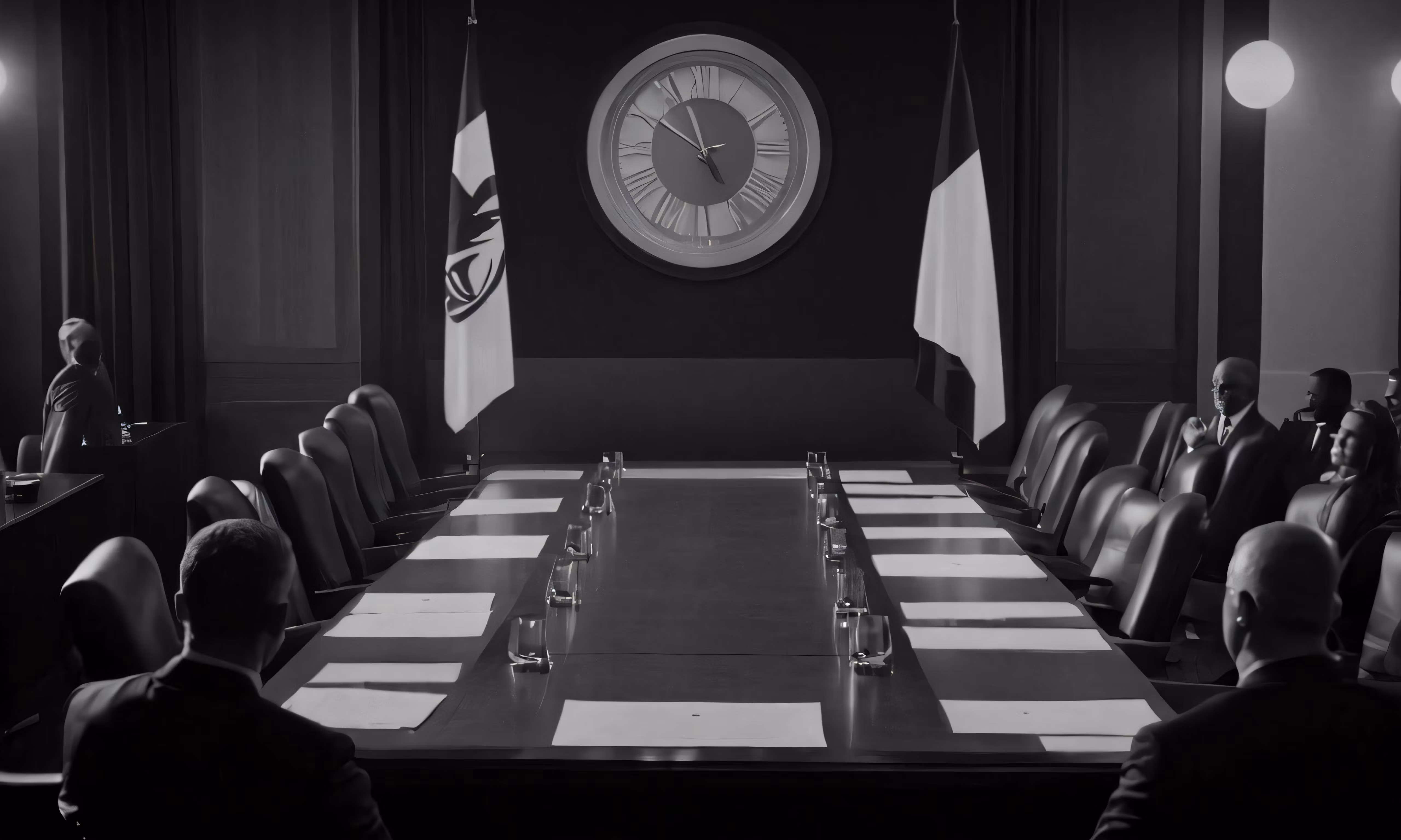 High resolution picture, free to use, several people sitting around a large conference room table with a clock in the background