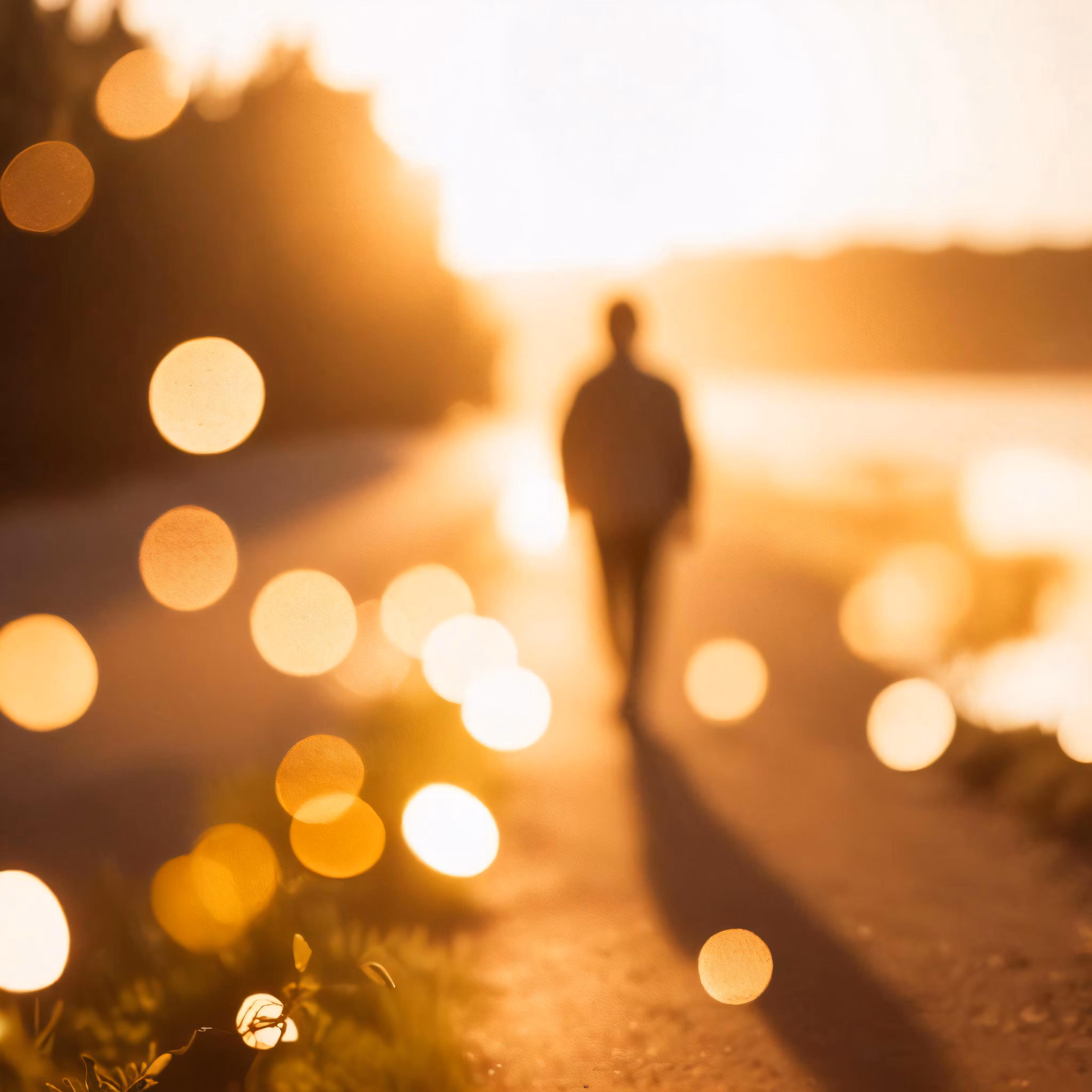 High resolution picture, free to use, silhouette of person walking on path at dusk with lights behind him