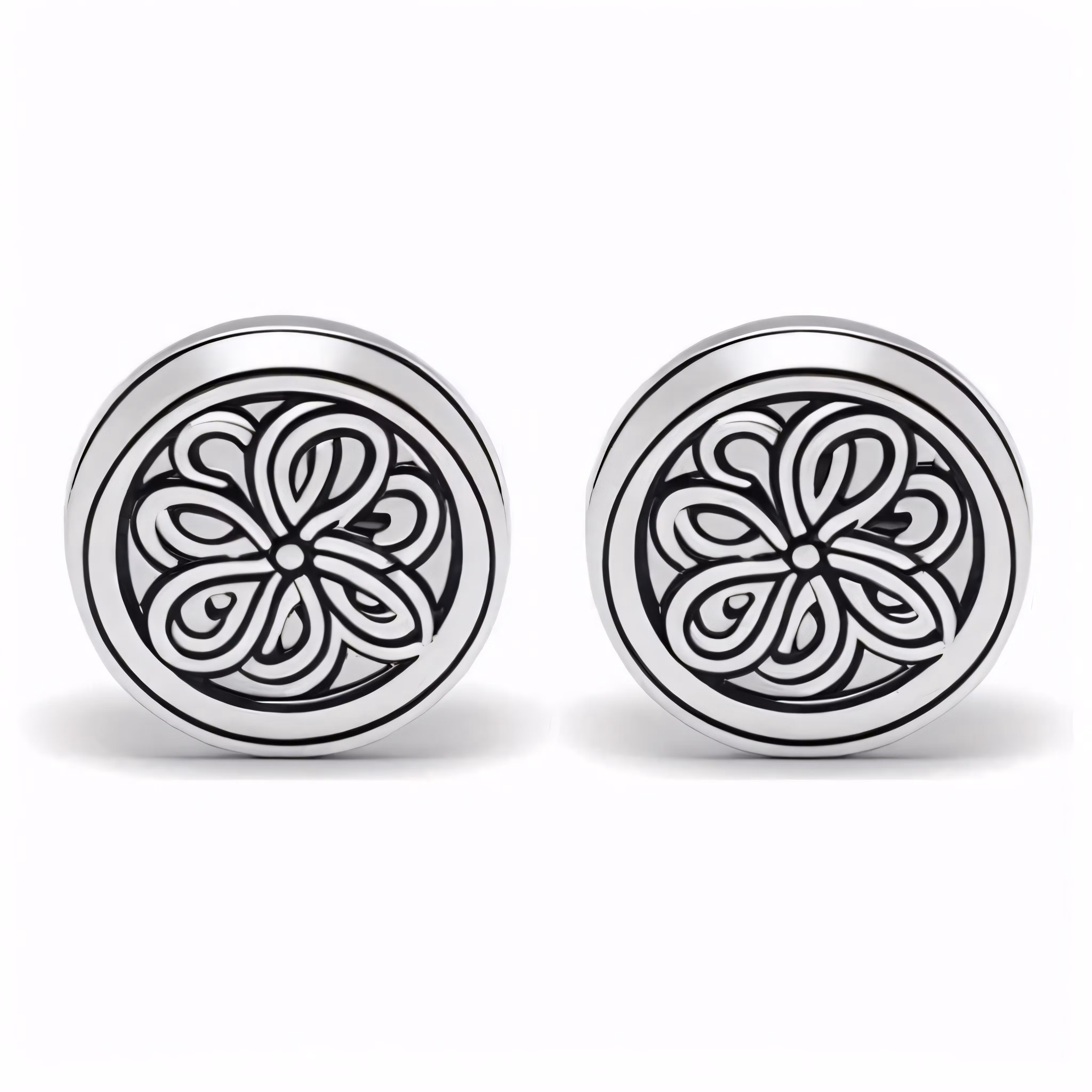 High resolution picture, free to use, silver and black flower stud earrings on a white background