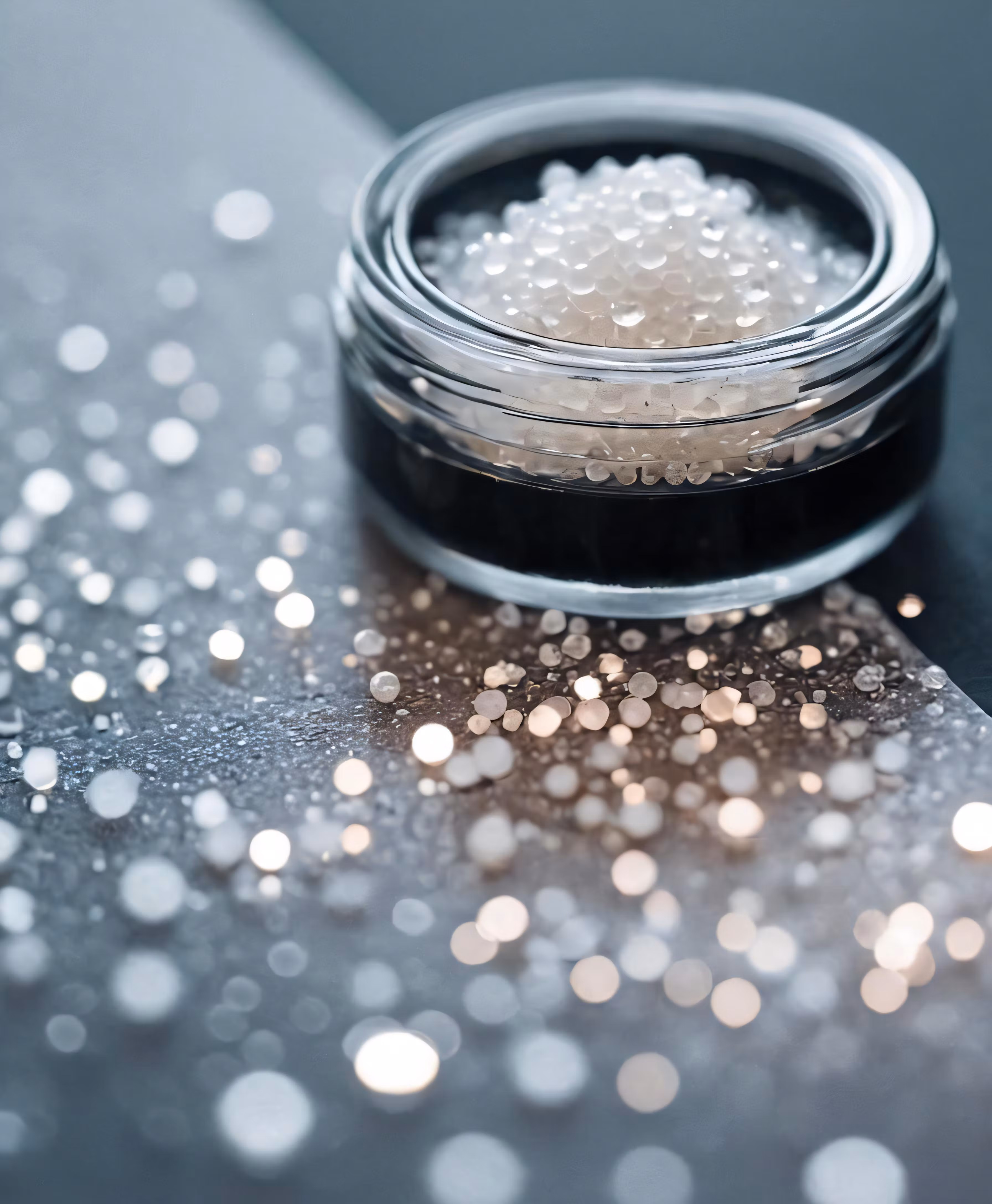High resolution picture, free to use, silver and white glitter in a jar on top of a black surface