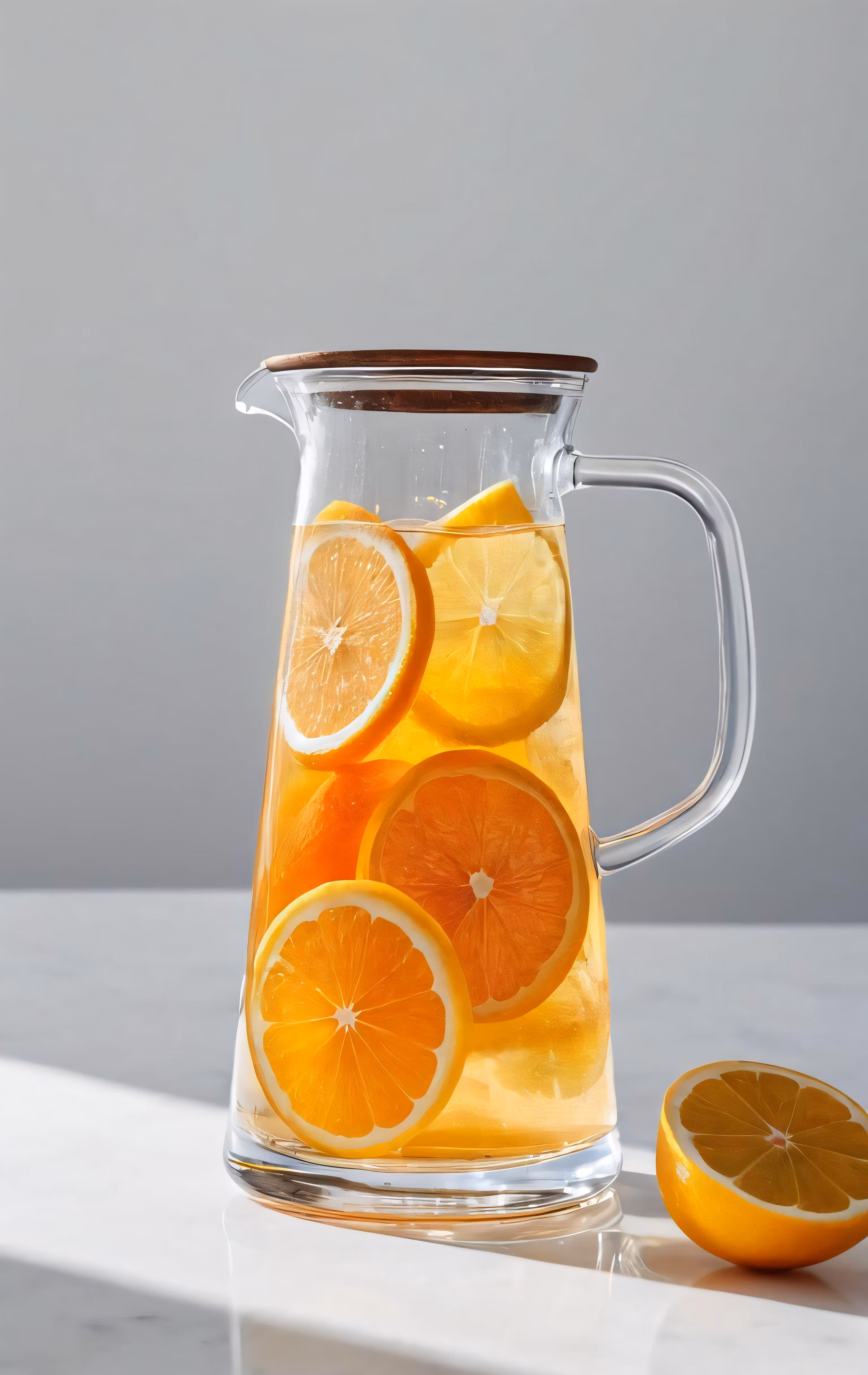 High resolution picture, free to use, sliced oranges are next to a pitcher of iced tea