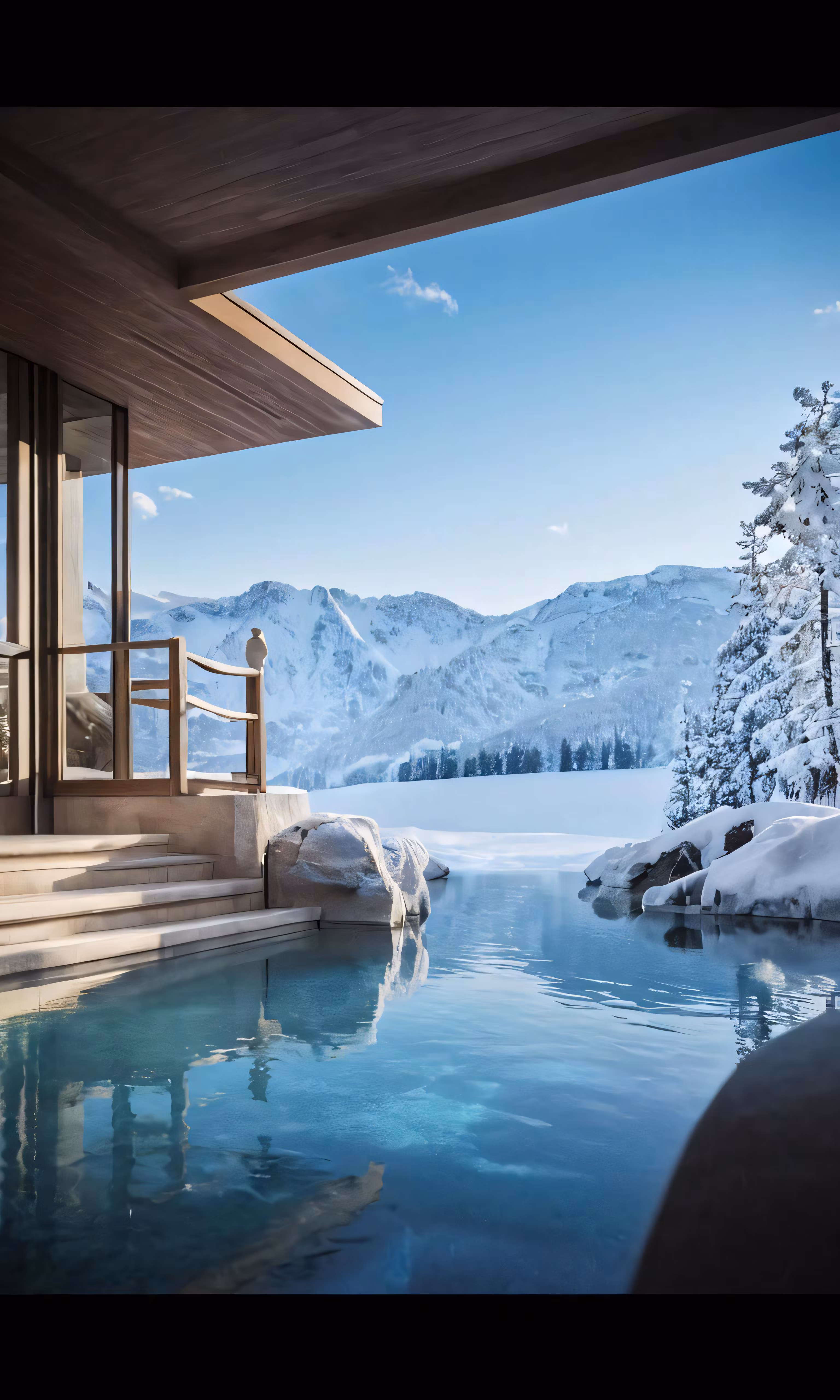 High resolution picture, free to use, snow covered mountains sit across the river from a modern villa