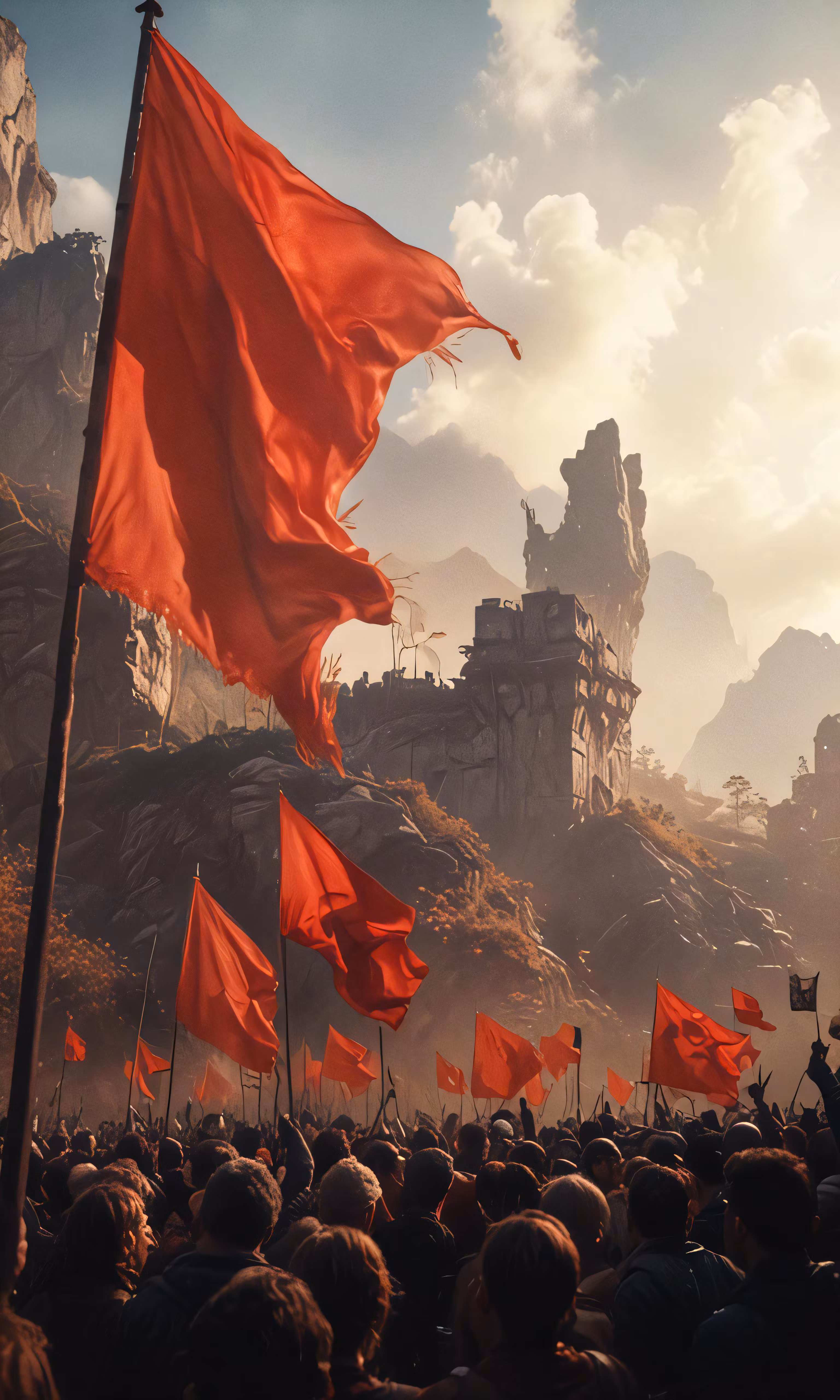 High resolution picture, free to use, some flags and some people are standing in front of some buildings