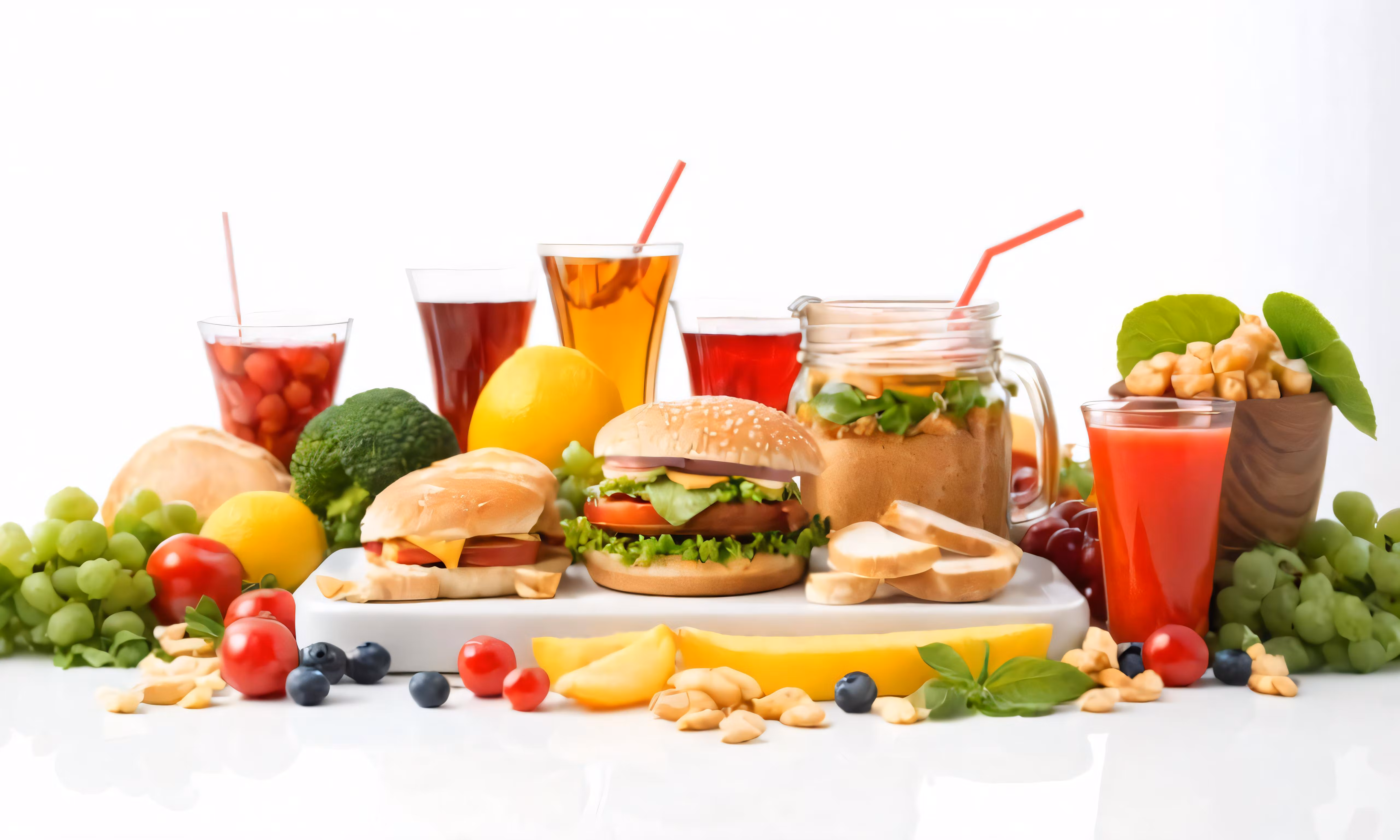 High resolution picture, free to use, some sandwiches and fruit are stacked with beverages