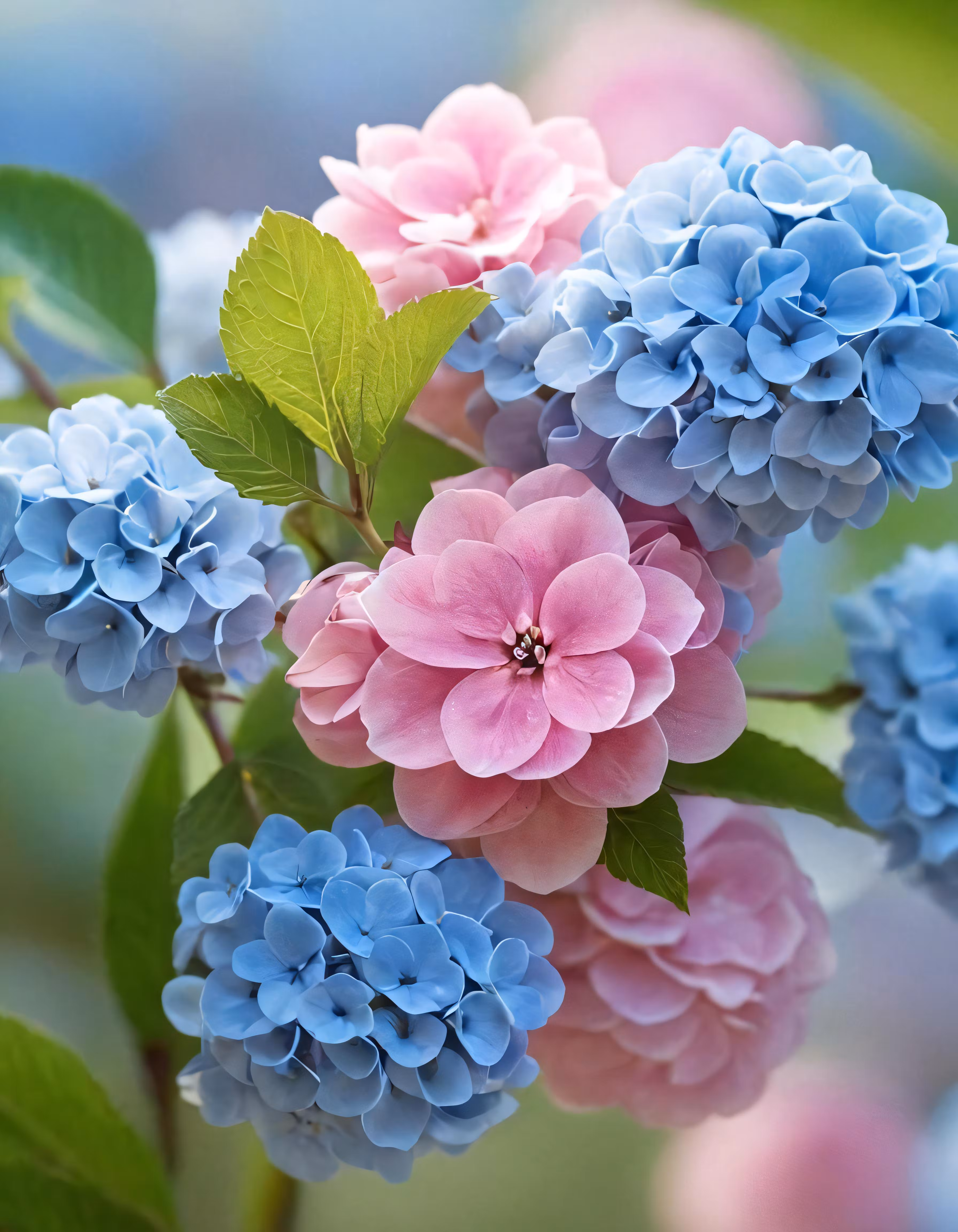 High resolution picture, free to use, some very pretty blue and pink flowers with leaves