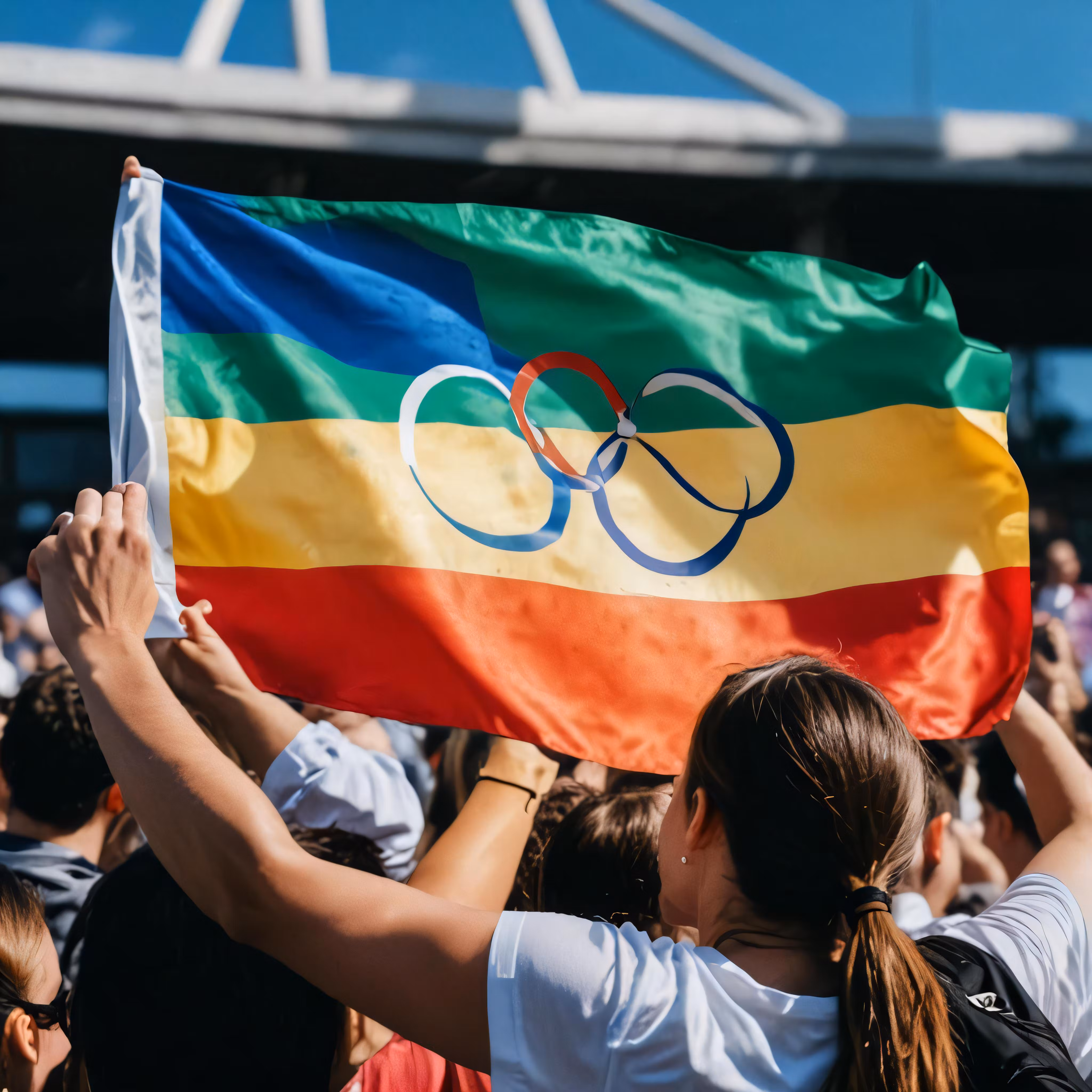 High resolution picture, free to use, spectators holding an olympic flag and waving a sign