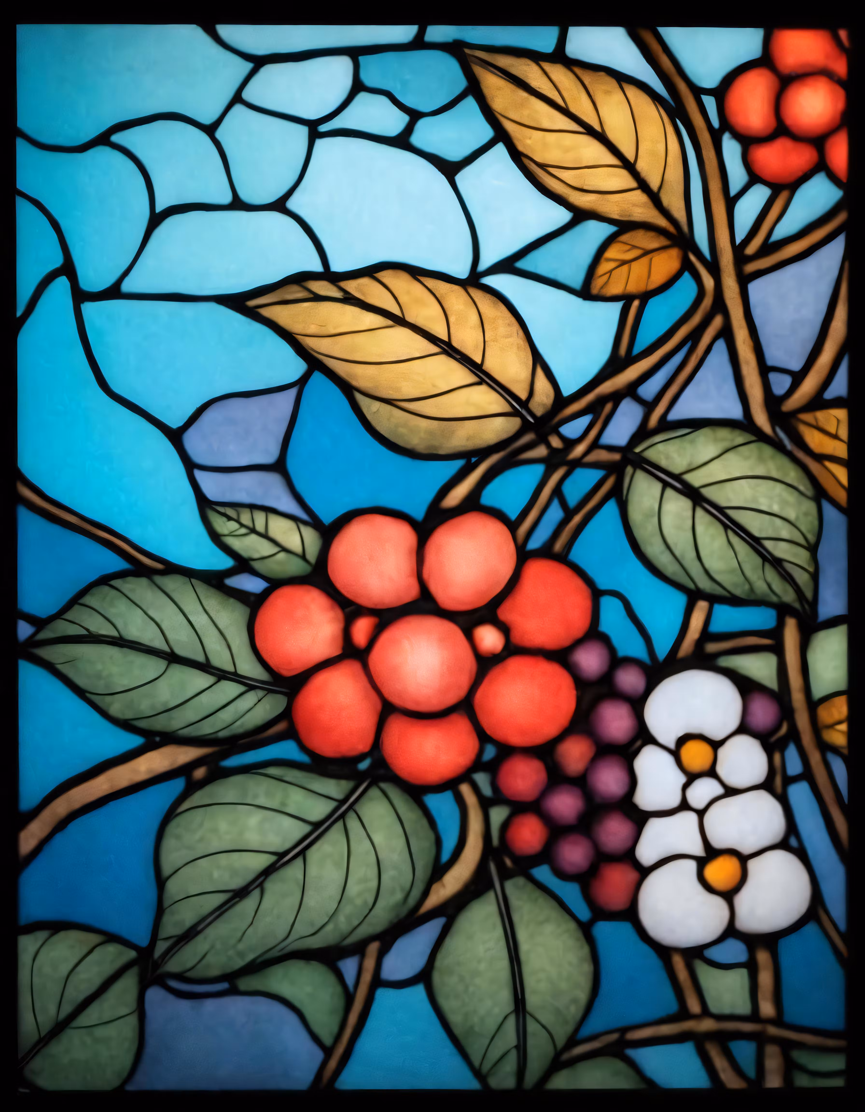 High resolution picture, free to use, stained glass window of red berries and white flowers