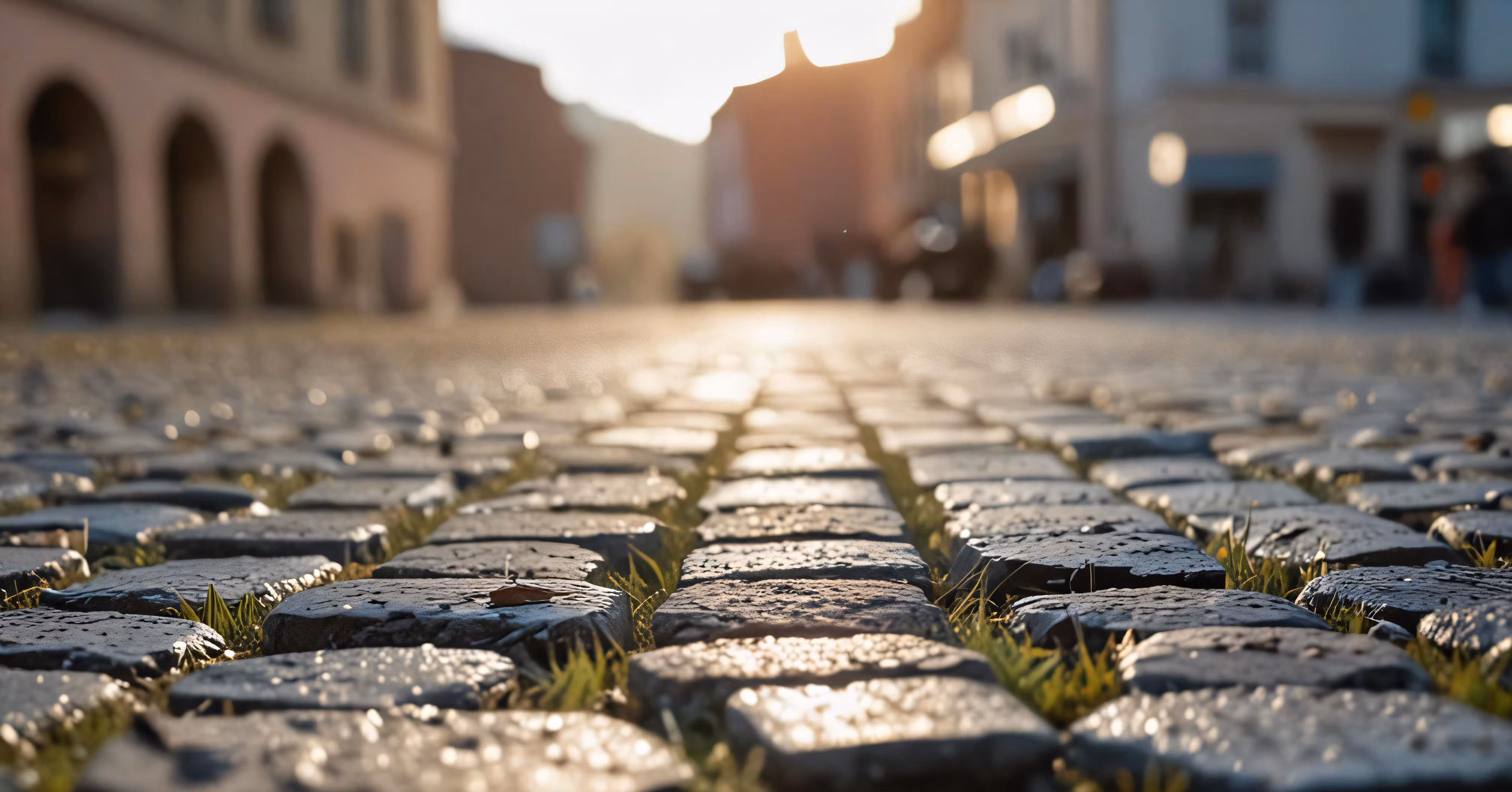 High resolution picture, free to use, stone street with building on one side and grass in the middle