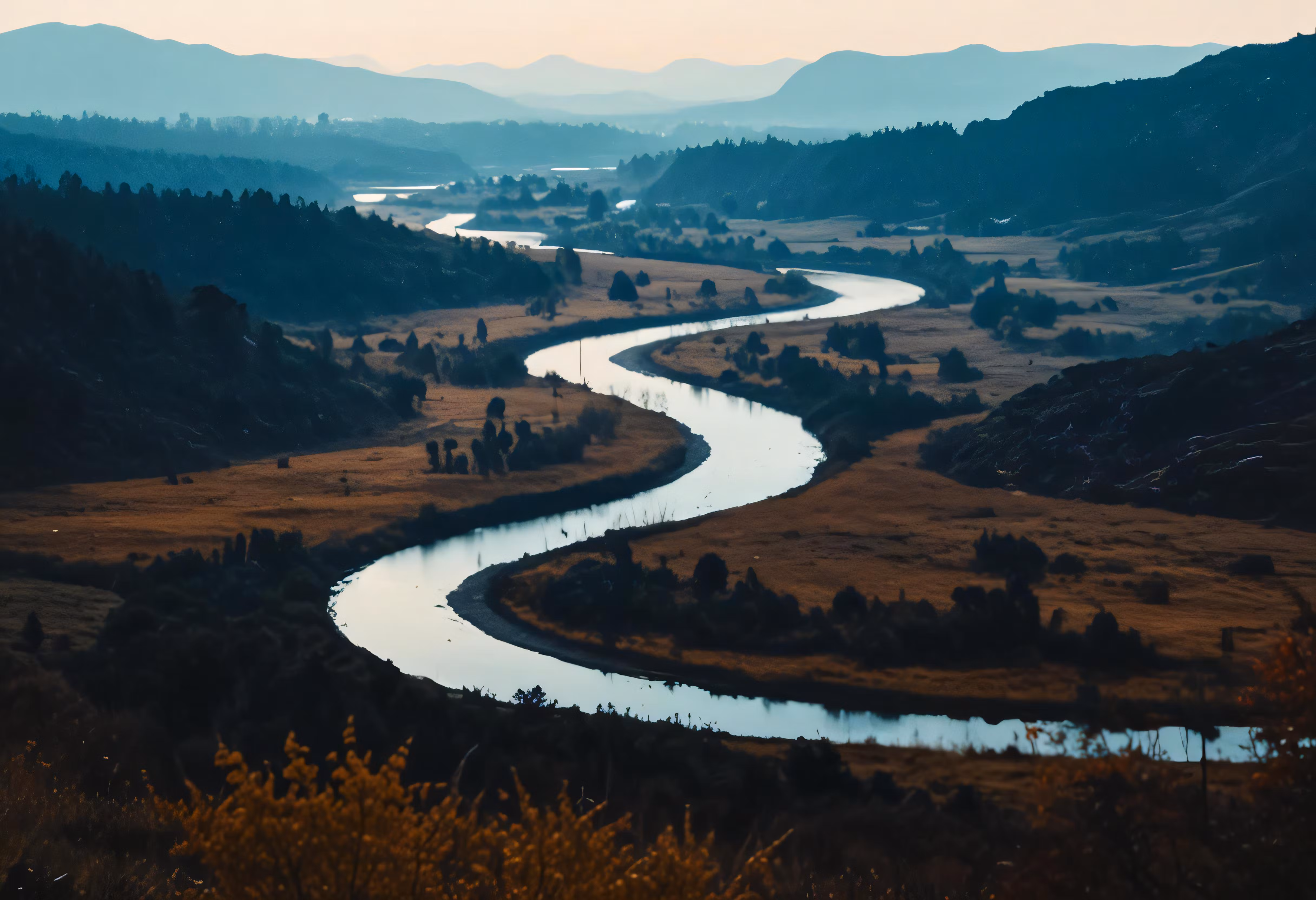High resolution picture, free to use, stream moving through grassy area with hills in background