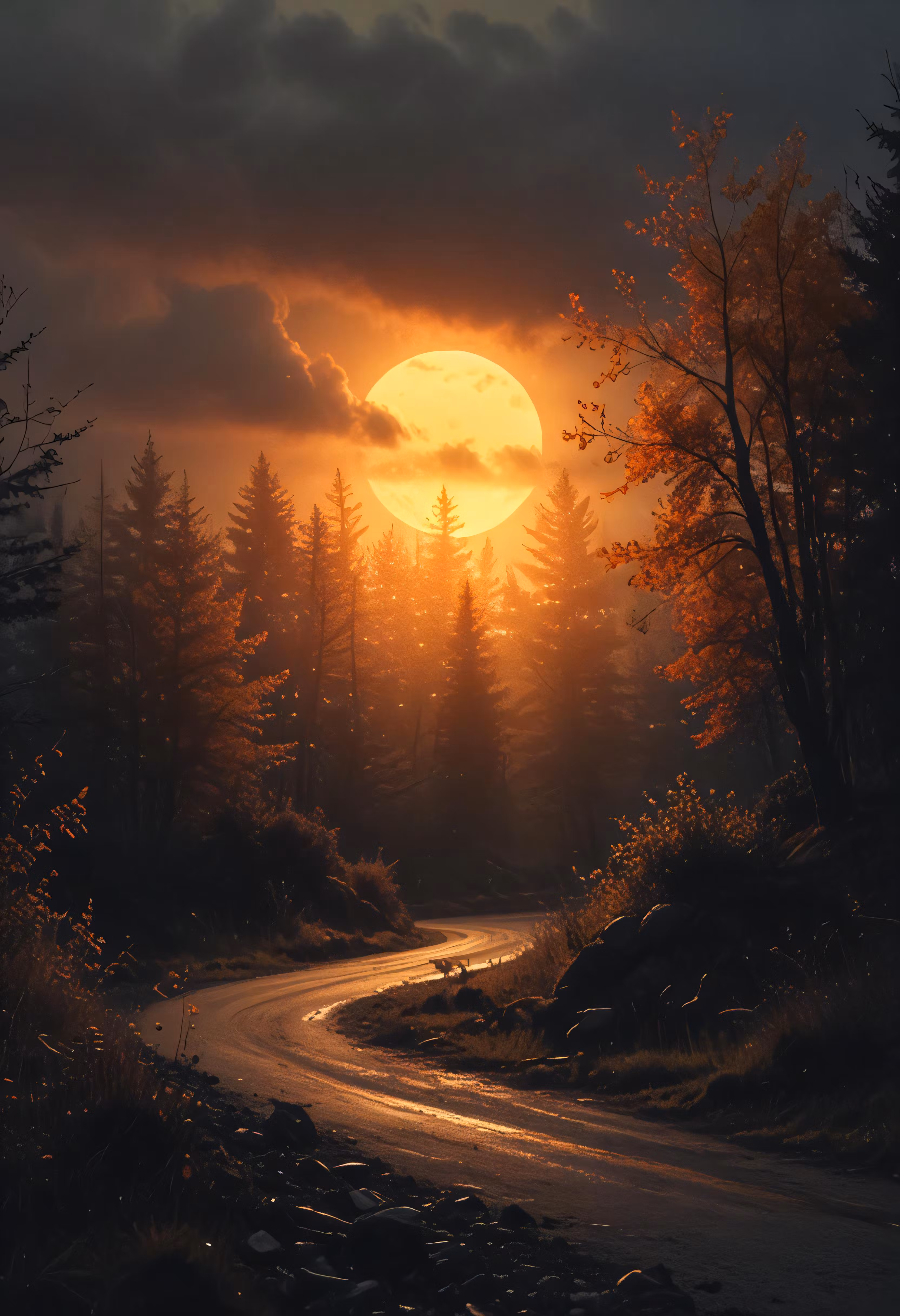 High resolution picture, free to use, sunset behind the sun in a foggy forest