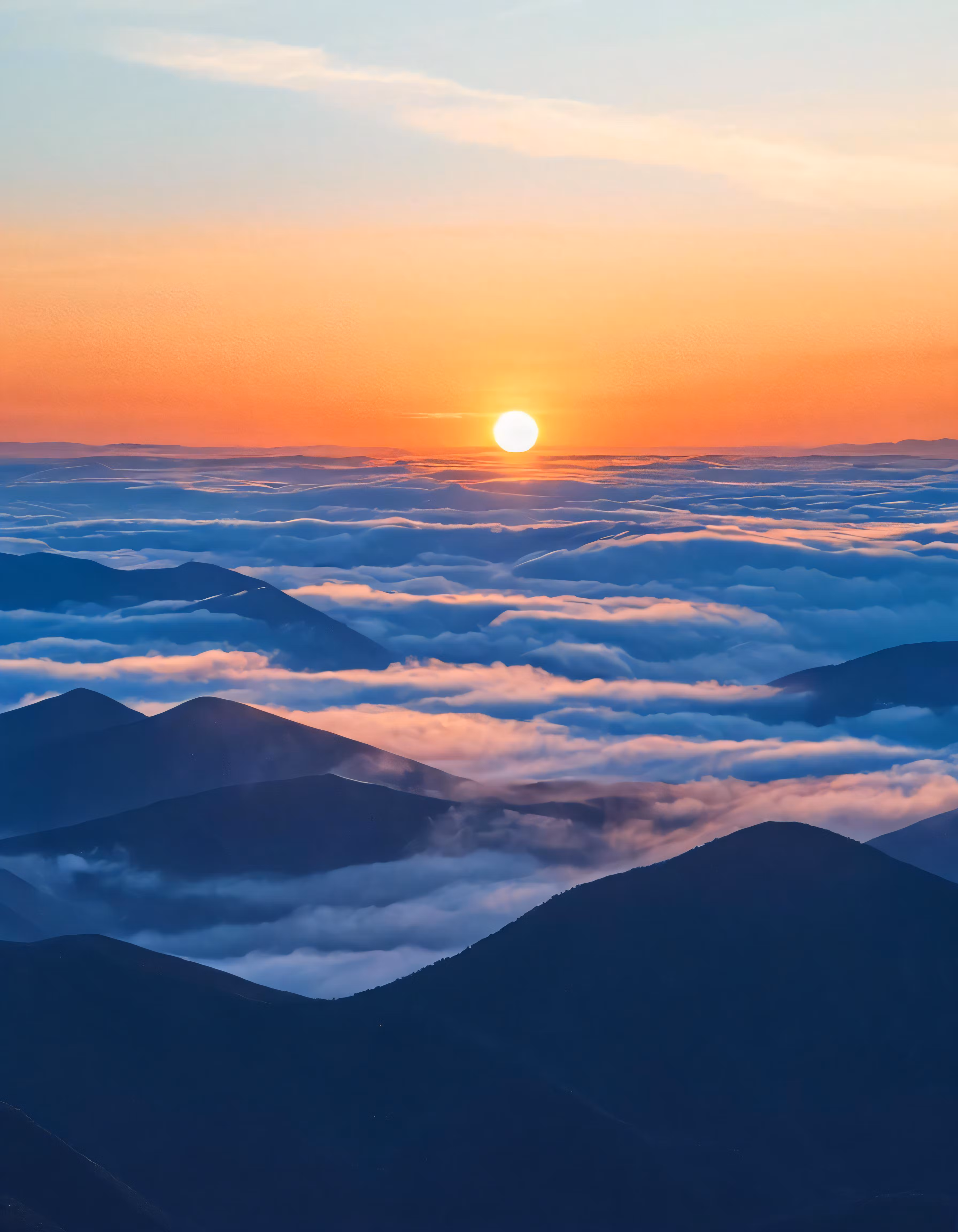 High resolution picture, free to use, sunset over mountains with low clouds below