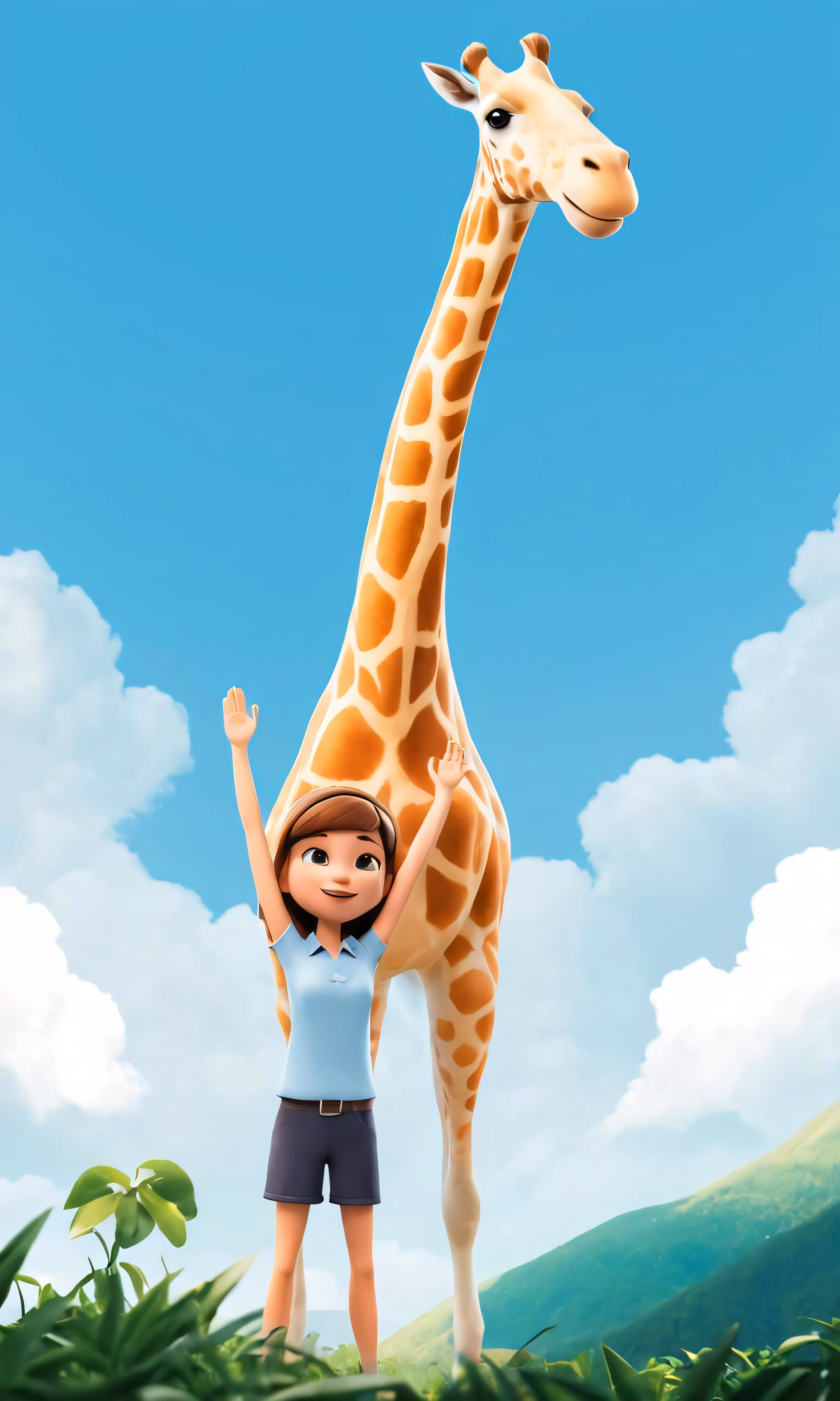 High resolution picture, free to use, the animated giraffe is standing in front of a person