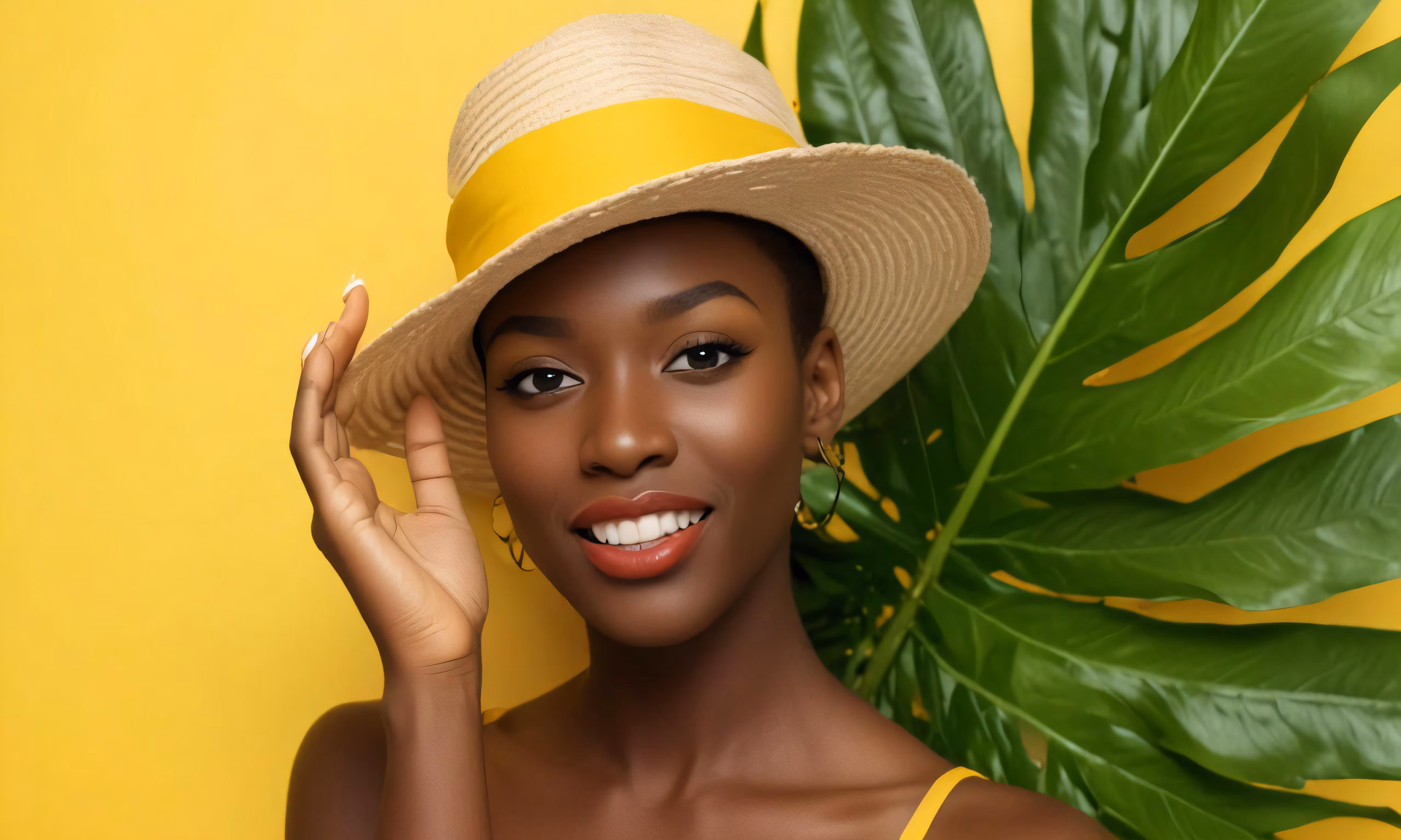 High resolution picture, free to use, the beautiful woman has a yellow dress and a big straw hat on